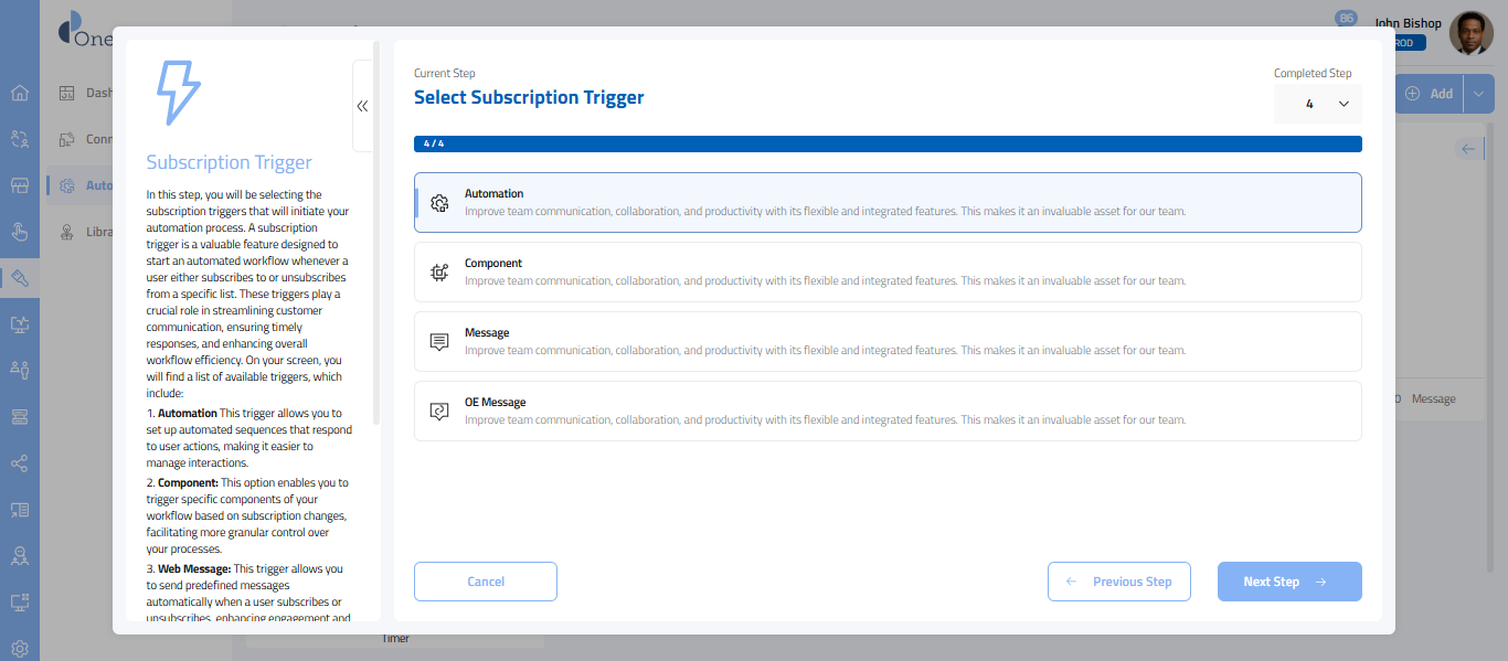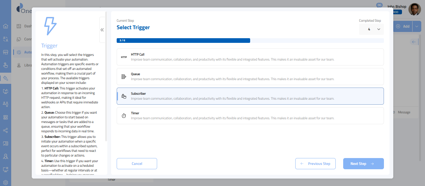 - Subscriber: With this trigger, you can initiate your automation when a specific event occurs within a subscribed trigger, making it ideal for workflows that require a response to particular changes or actions.