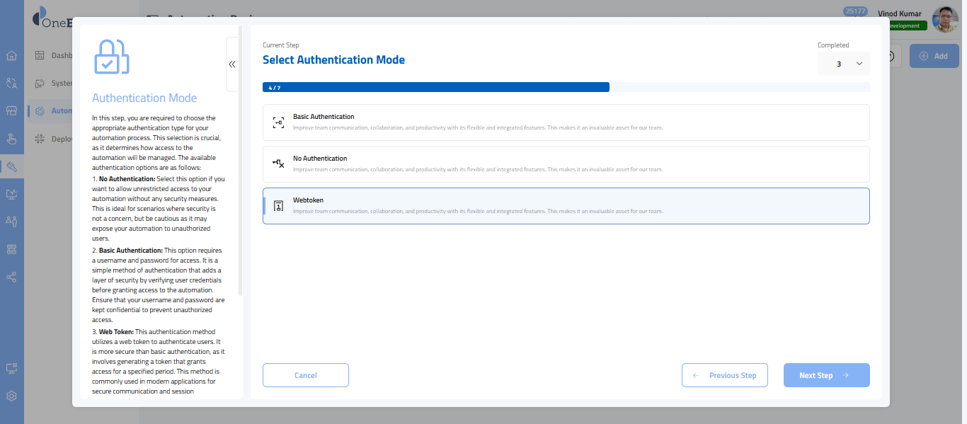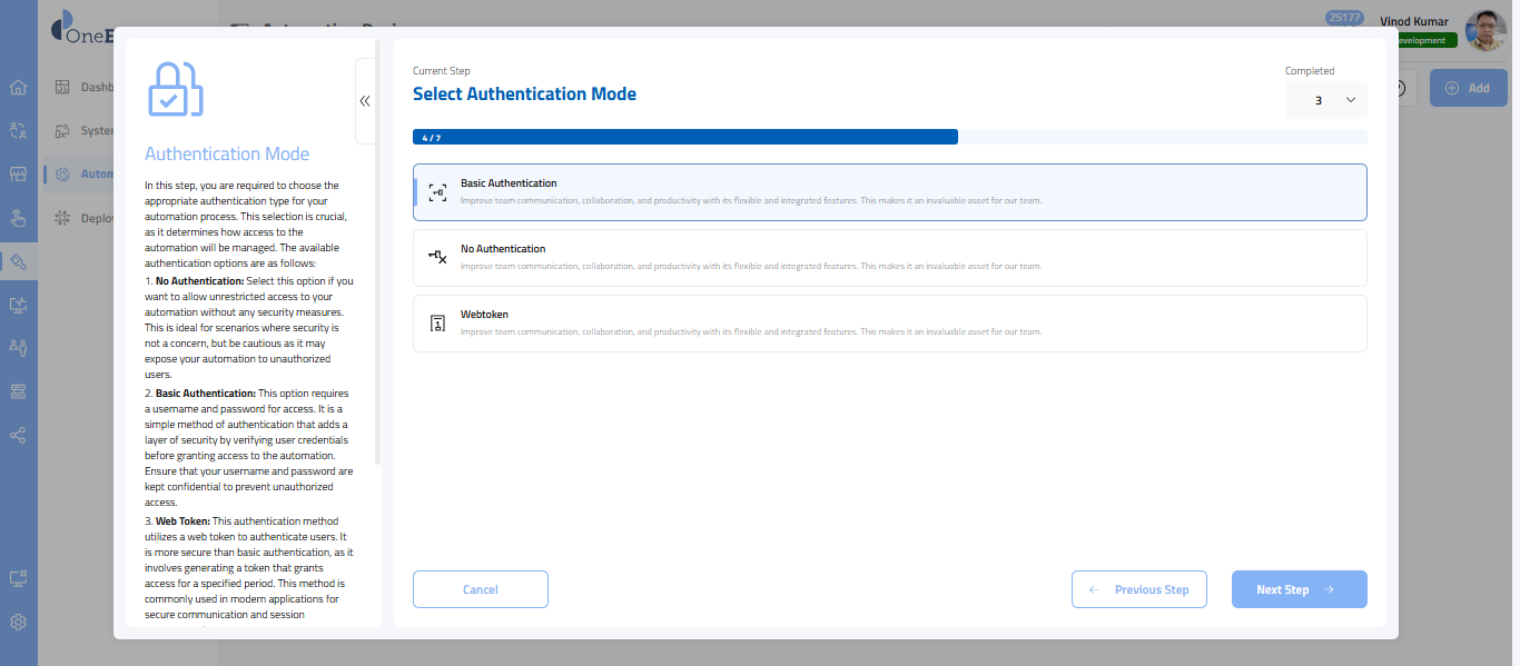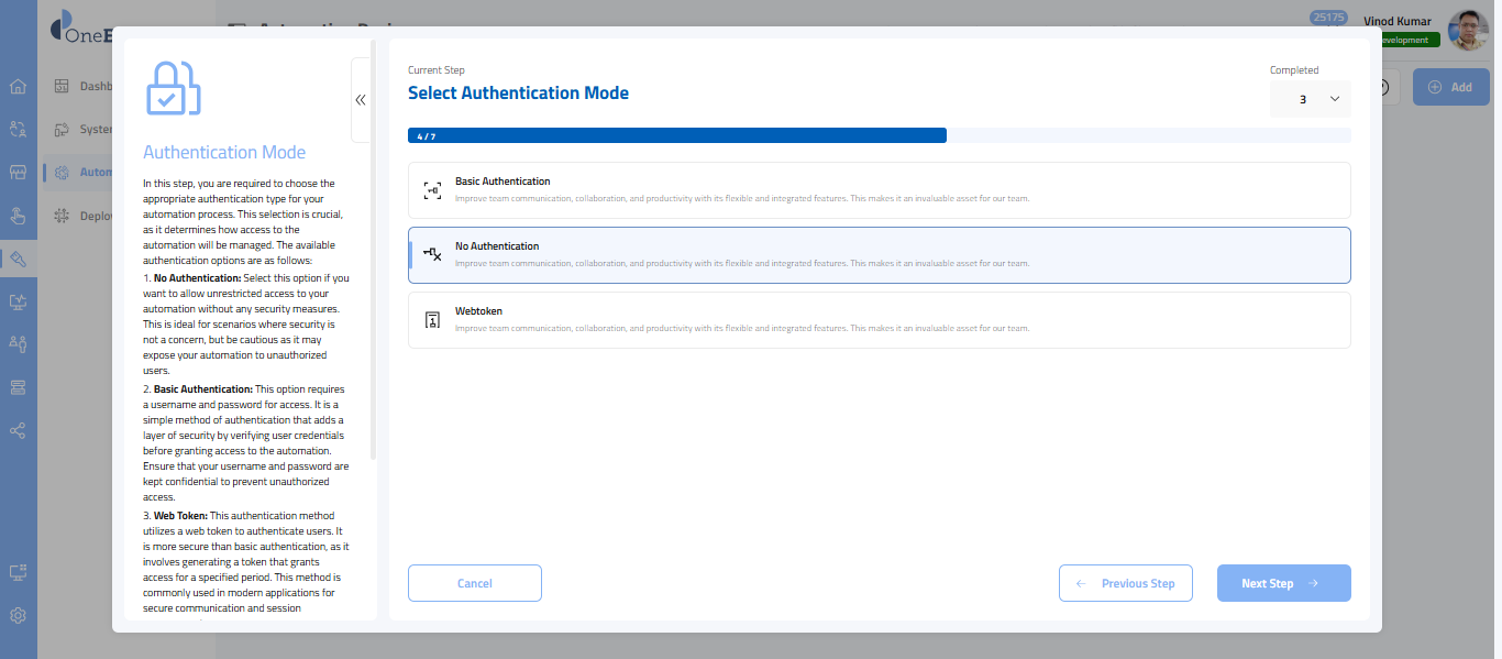 - Once you have chosen the authentication type, you need to select the execution type of your automation. We support the following execution types: