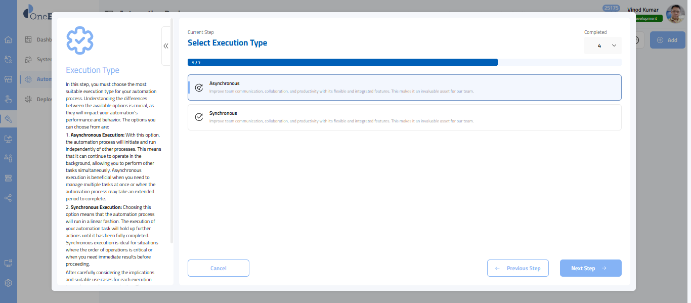 - Synchronous Execution: Choosing this option means the automation process will proceed linearly. Your automation task will delay further actions until it has finished. This method is best suited for scenarios where the sequence of operations is crucial or when immediate results are required before proceeding.