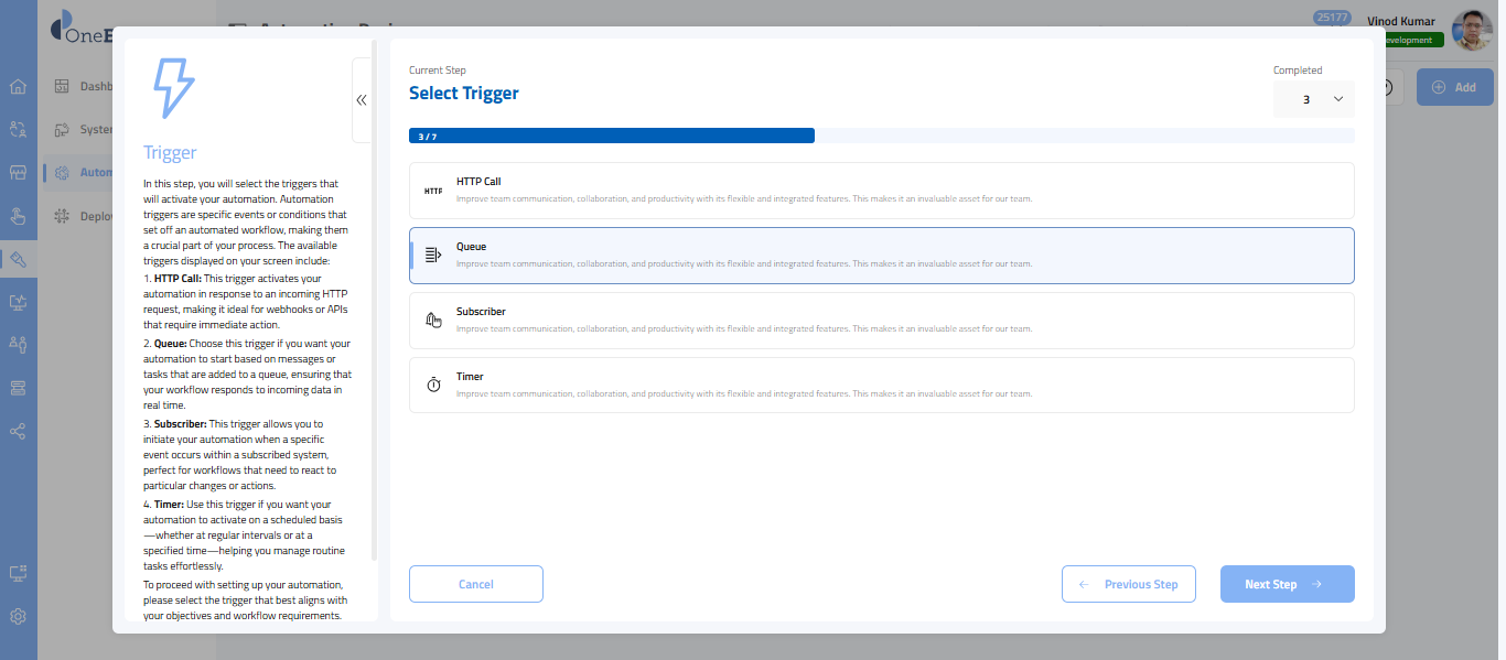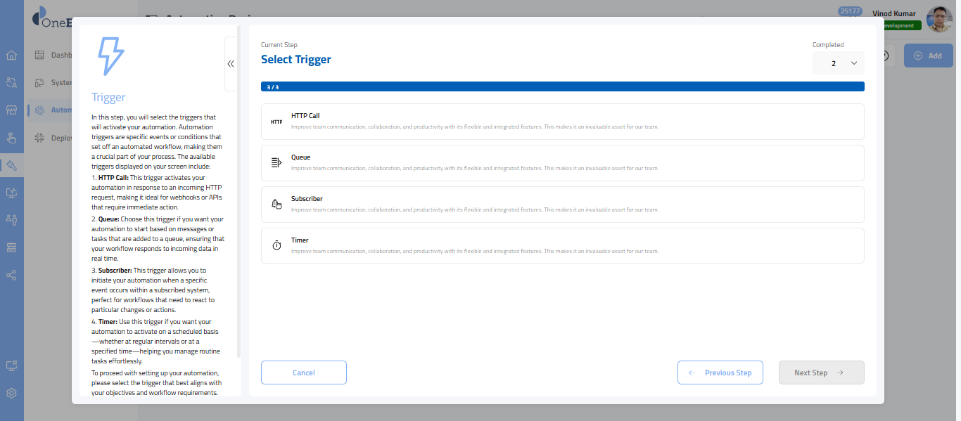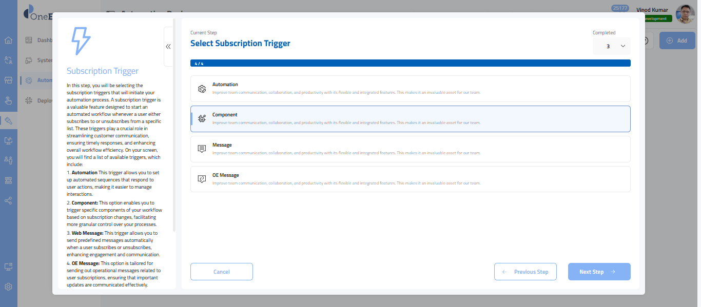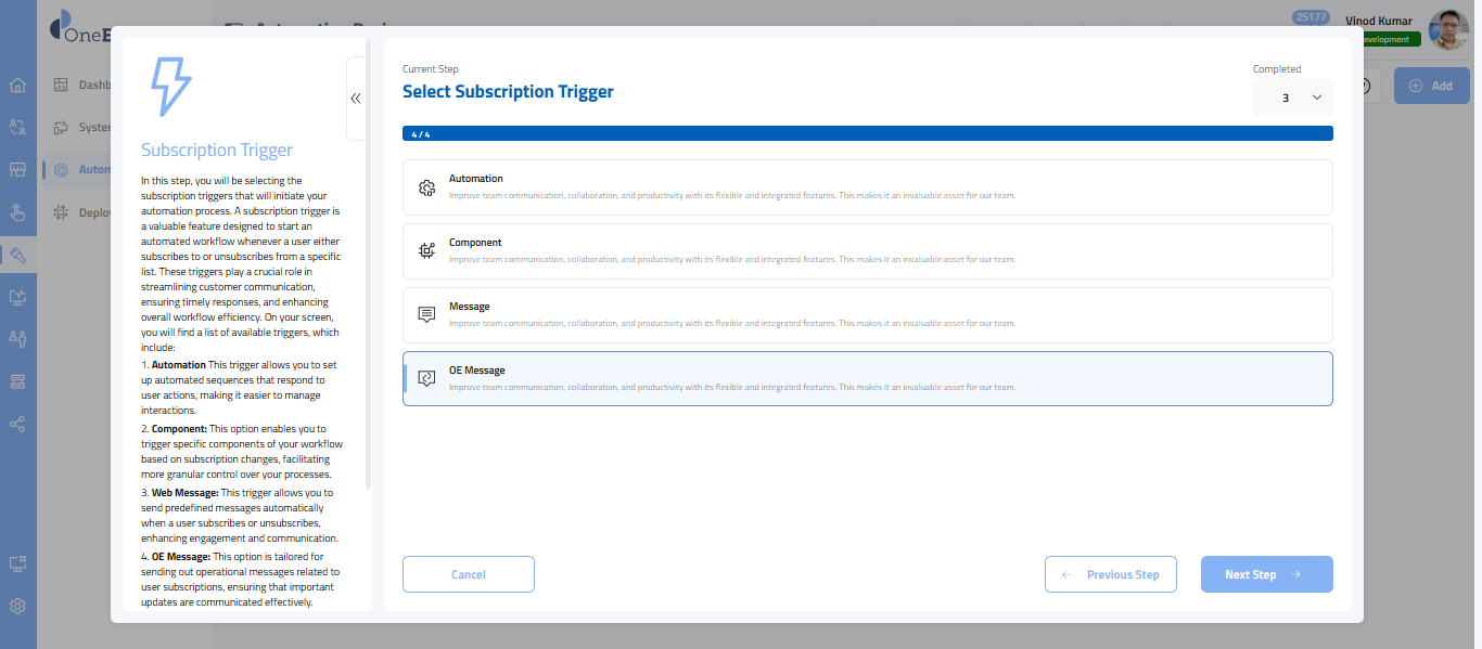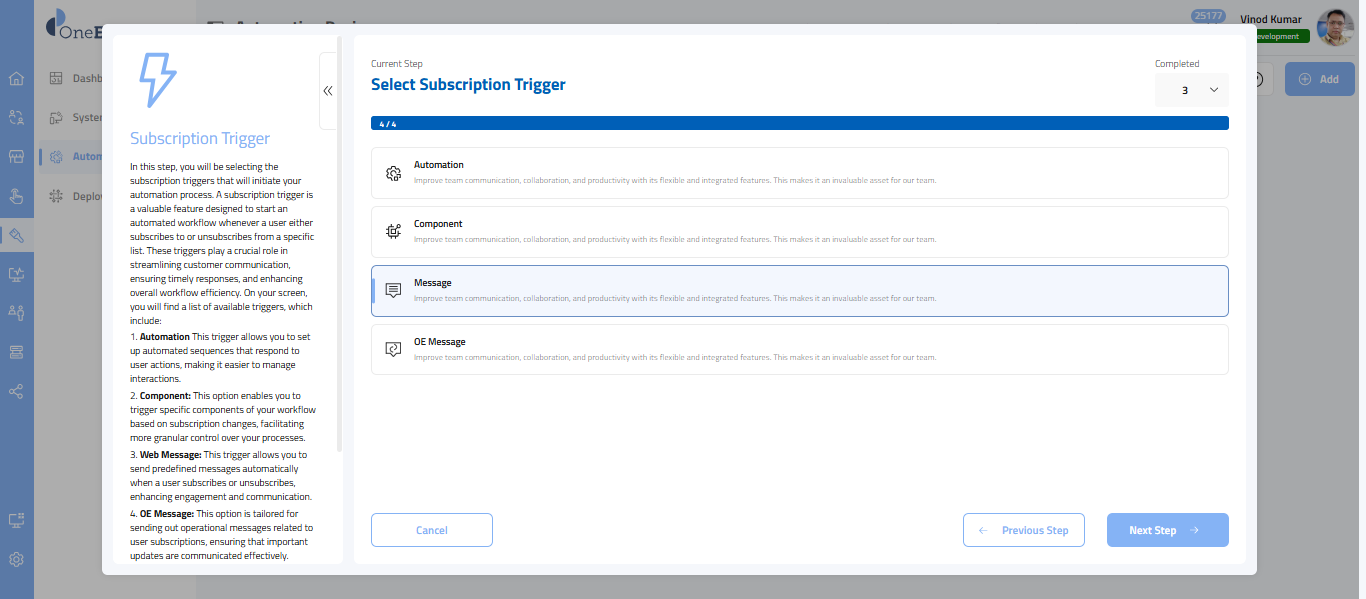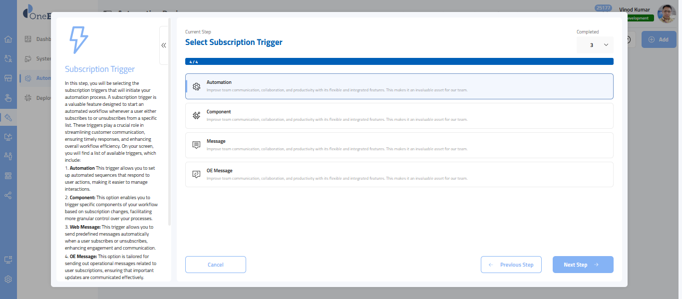 Once you have selected Automation, in this step, you will choose the subscription triggers that initiate your automation process.
