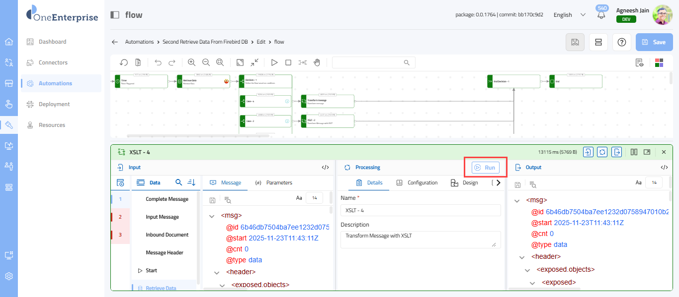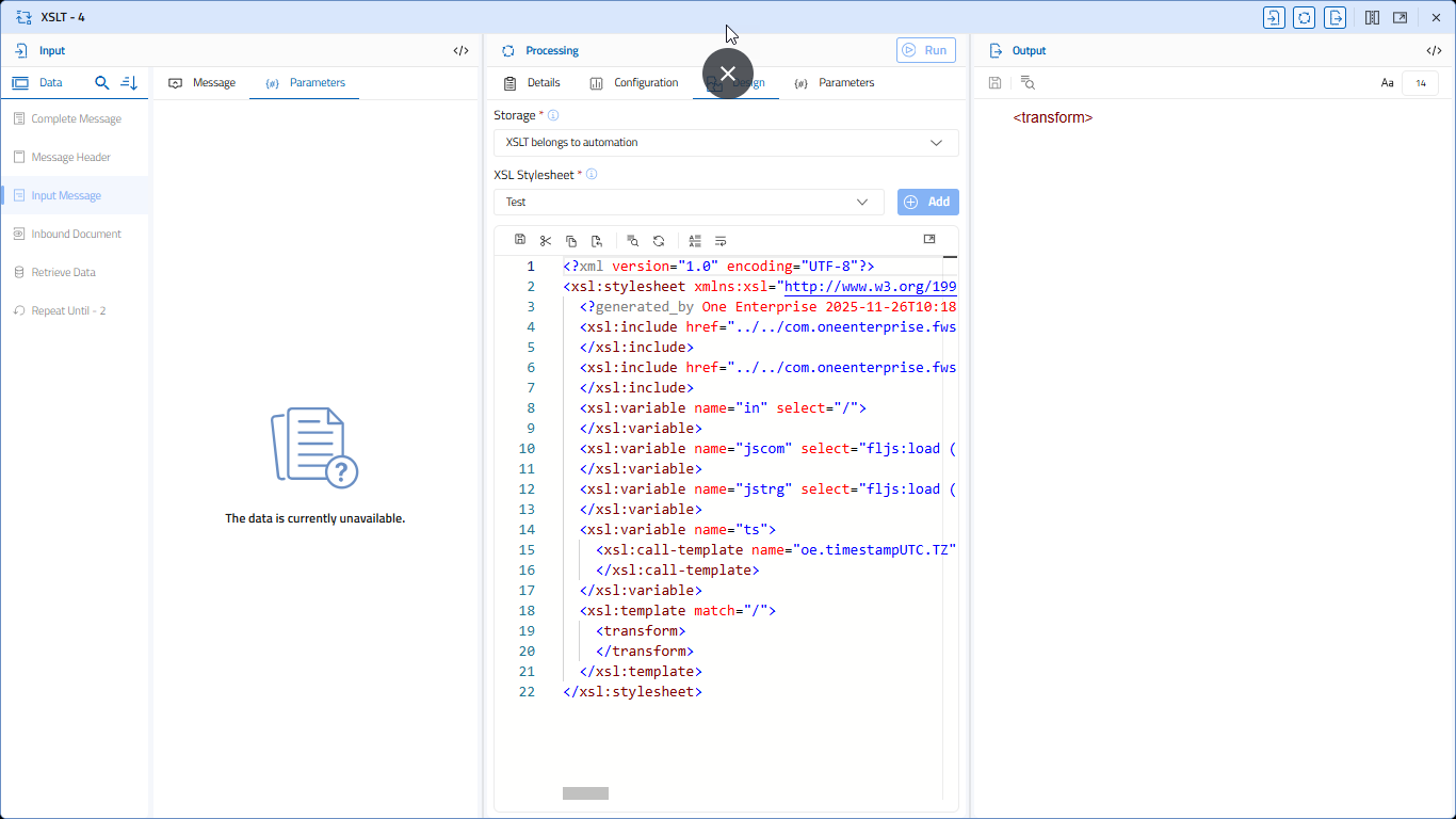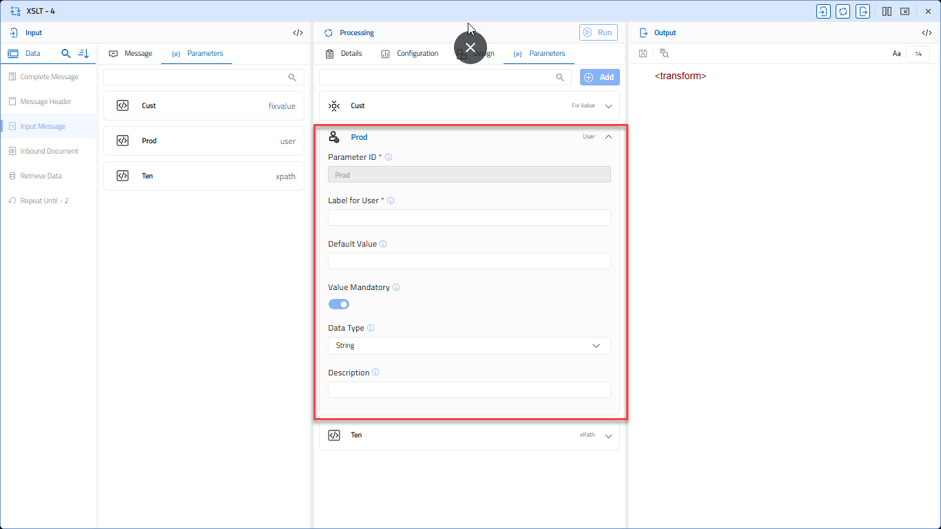 - The Run button is provided in the header. This allows you to run the selected unit individually and view its output data in the Output section.