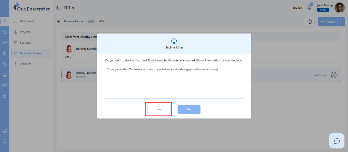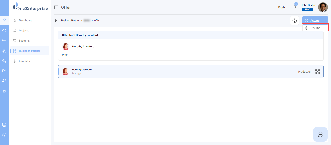 When you receive a partnership offer from one of your business partners, you can either accept or decline the offer. You will have the opportunity to carefully consider the offer and can choose to either accept or decline it based on your assessment. This article describes the steps to decline the offer.