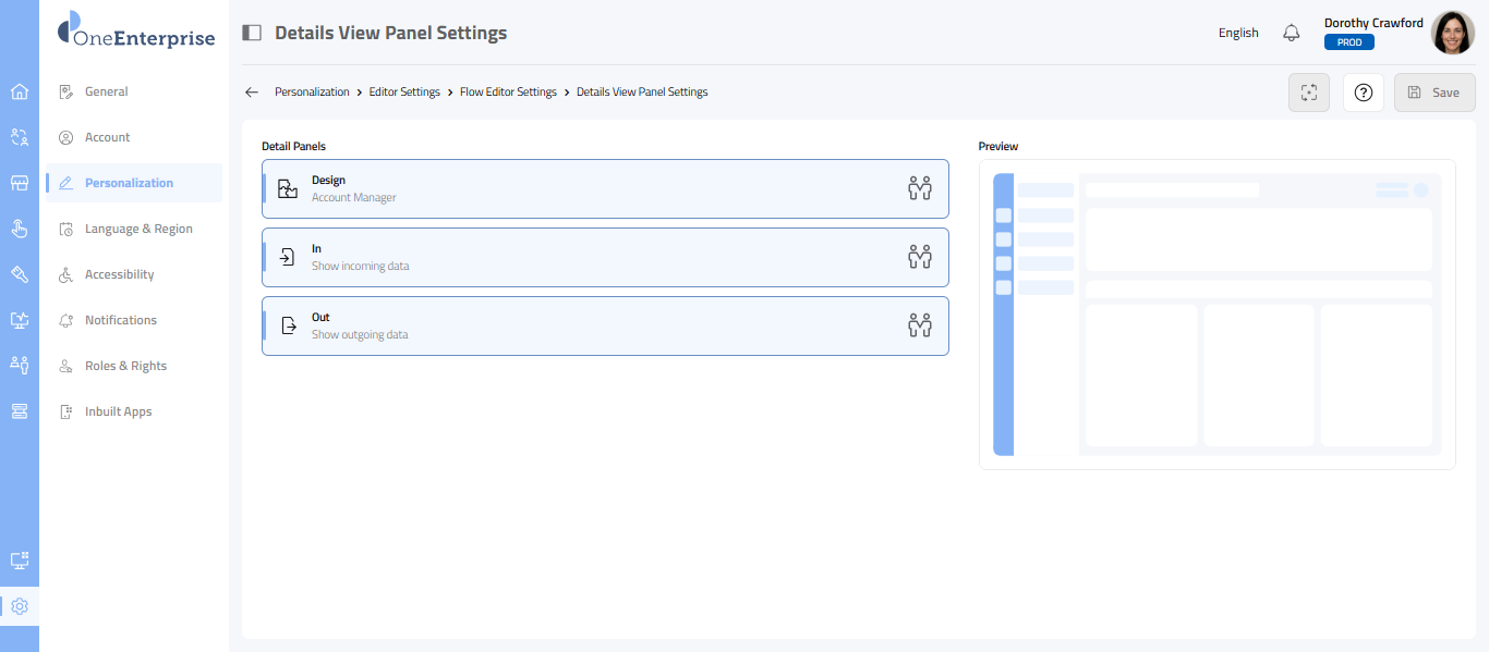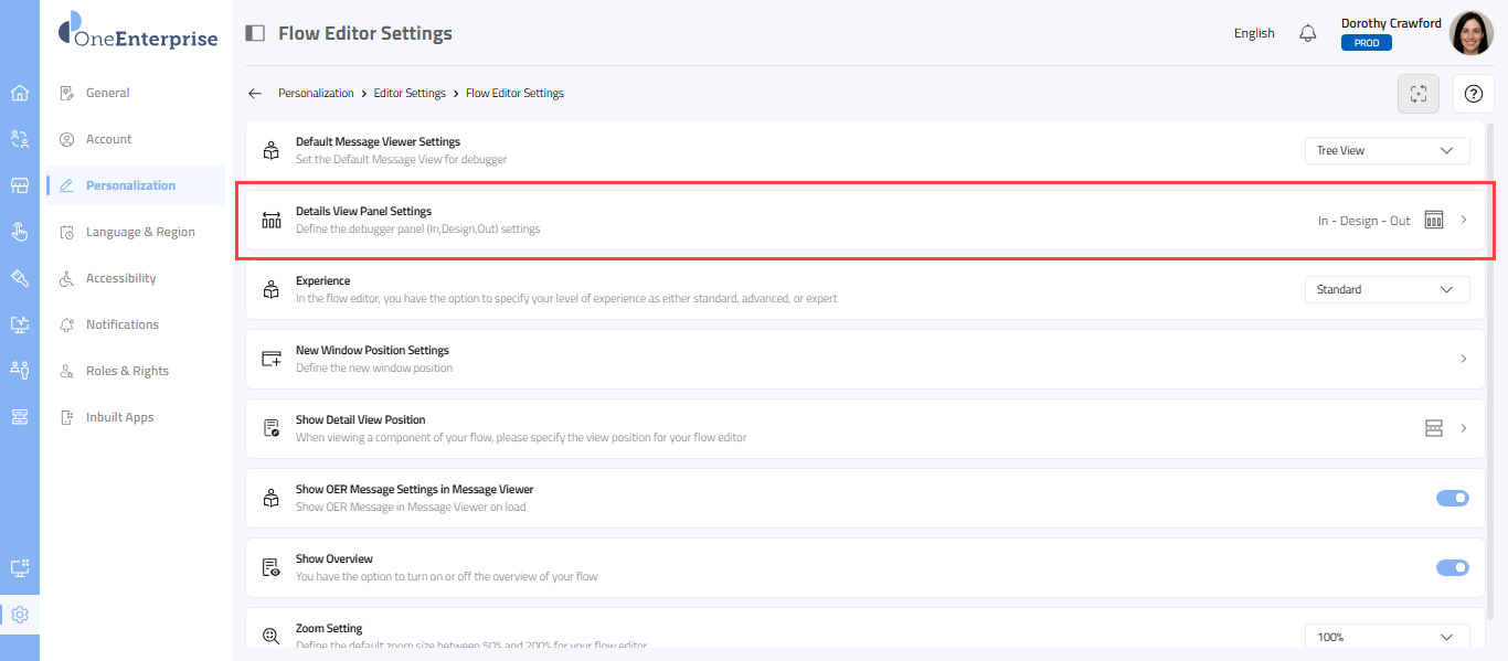 This section explains how to set the position of the Details View screen in the Flow Editor. Navigate to the Flow Editor Navigation: Settings > Personalization >Editor Settings >Flow Editor > Show Details View Position Select the Settings icon on the ...