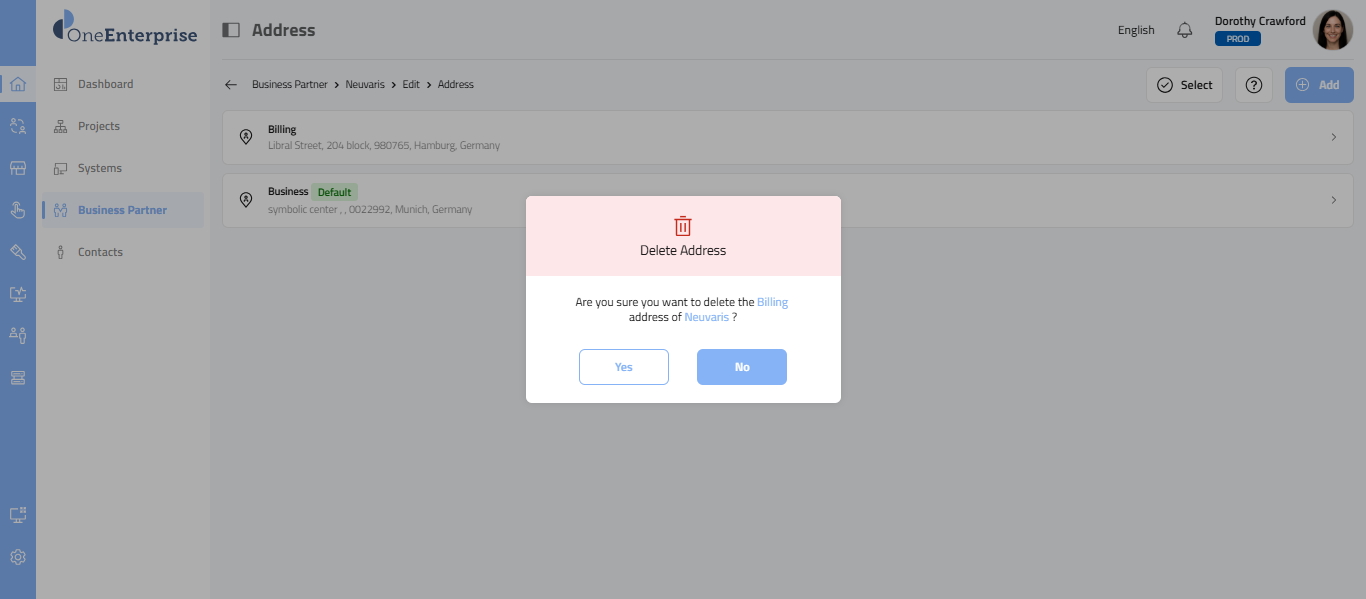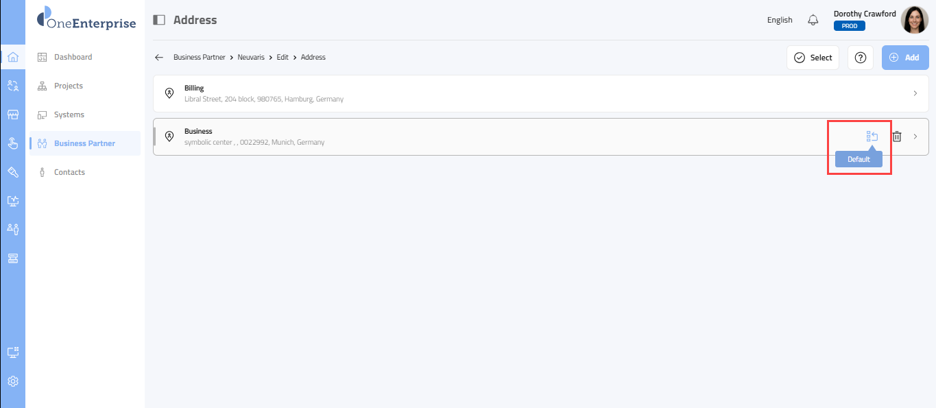- The Default icon allows you to designate a selected address as your default address for your business partner.