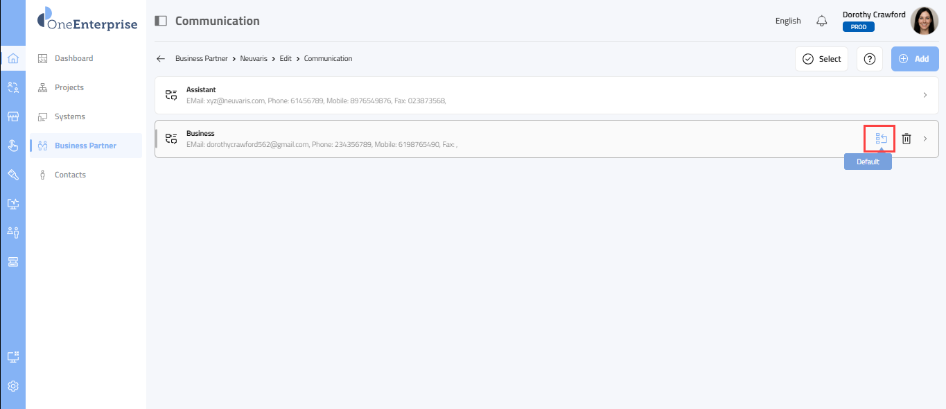 - The Default icon allows you to designate a selected communication as your default communication for your business partner.