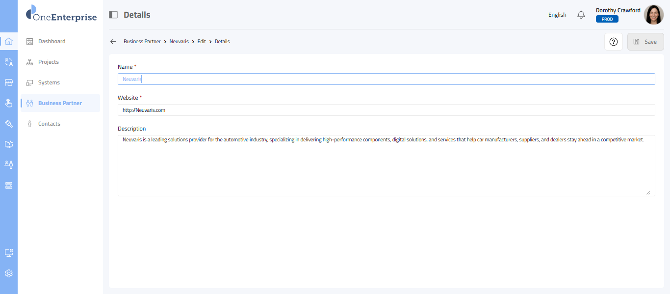- Description: A Description field where you can modify the short description of the business partner.