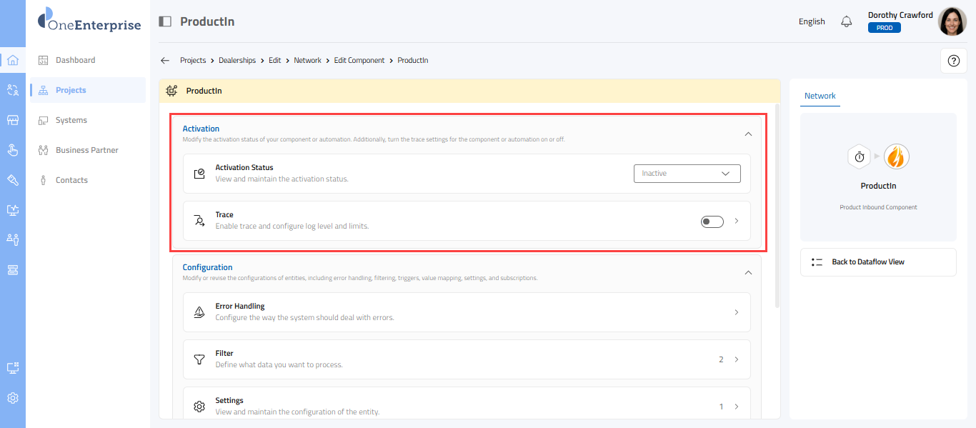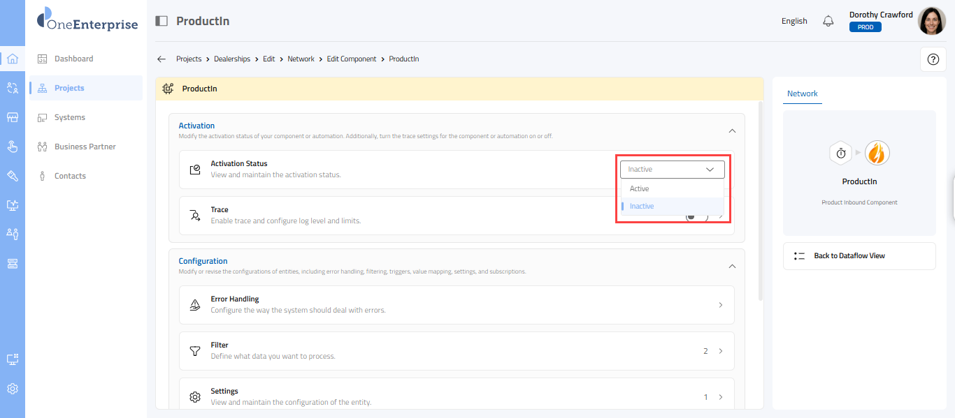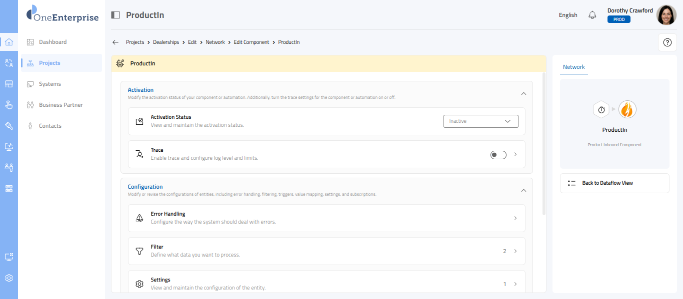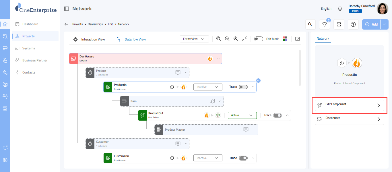 This section will provide information on editing components in your project network. Please note that the component can only be edited from the Dataflow View. The Interaction View does not provide this functionality. Once you are on the Dataflow view, click on any component node. The component details and menu options are displayed on the Network tab upon clicking the node.