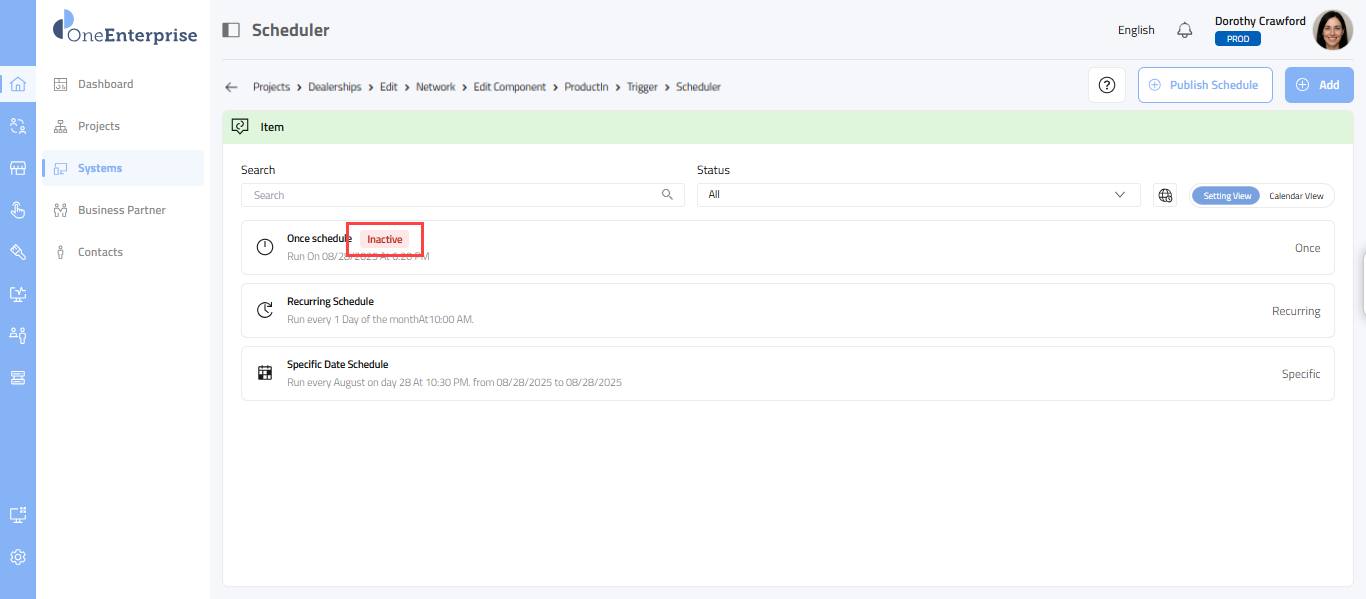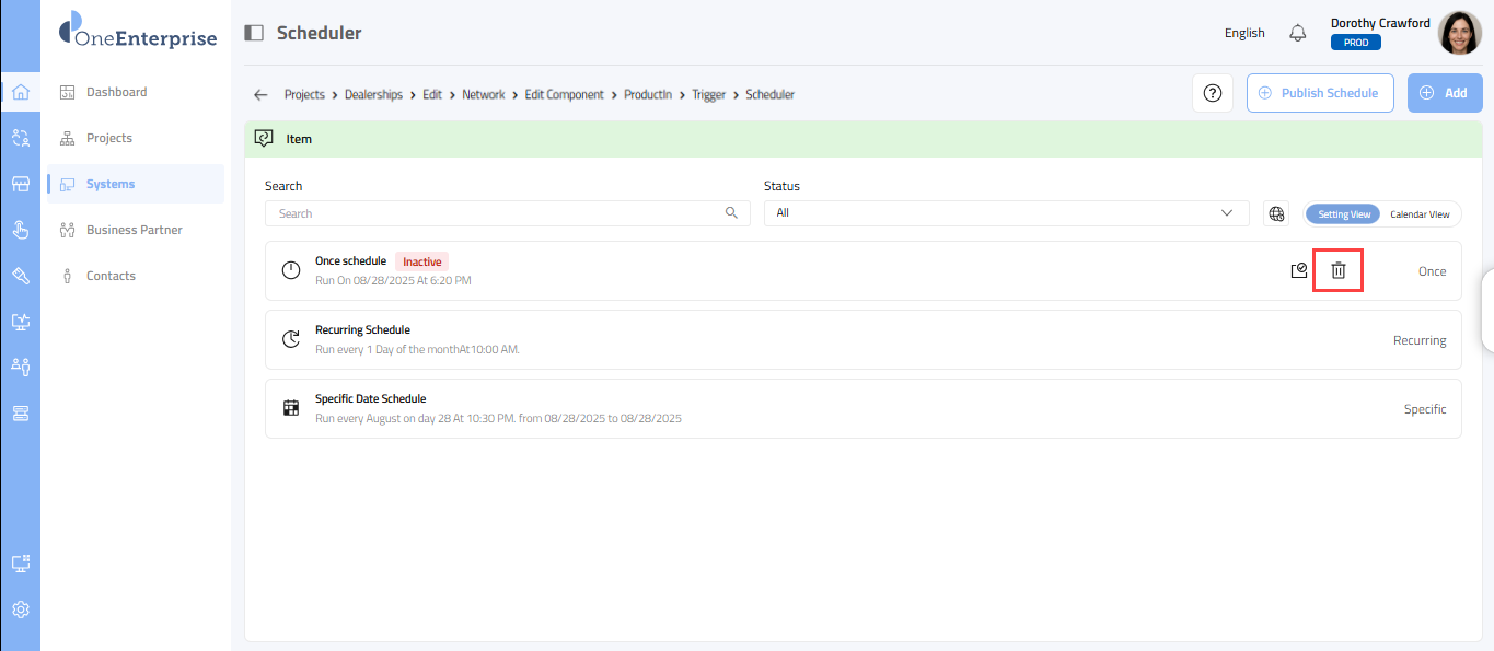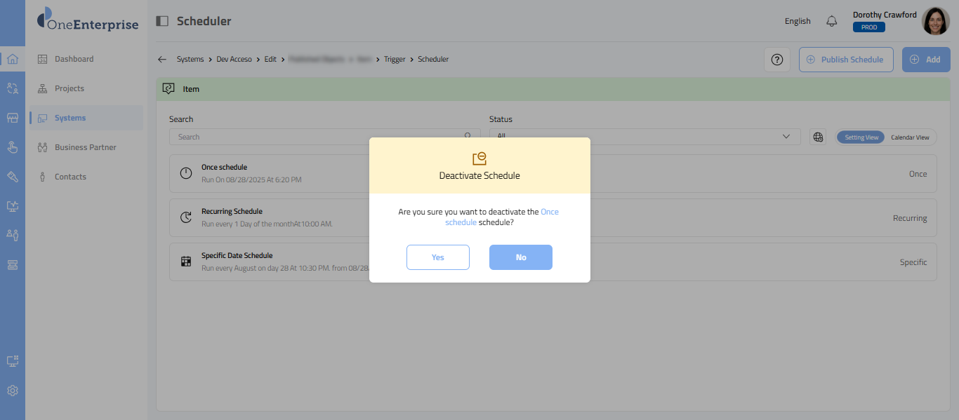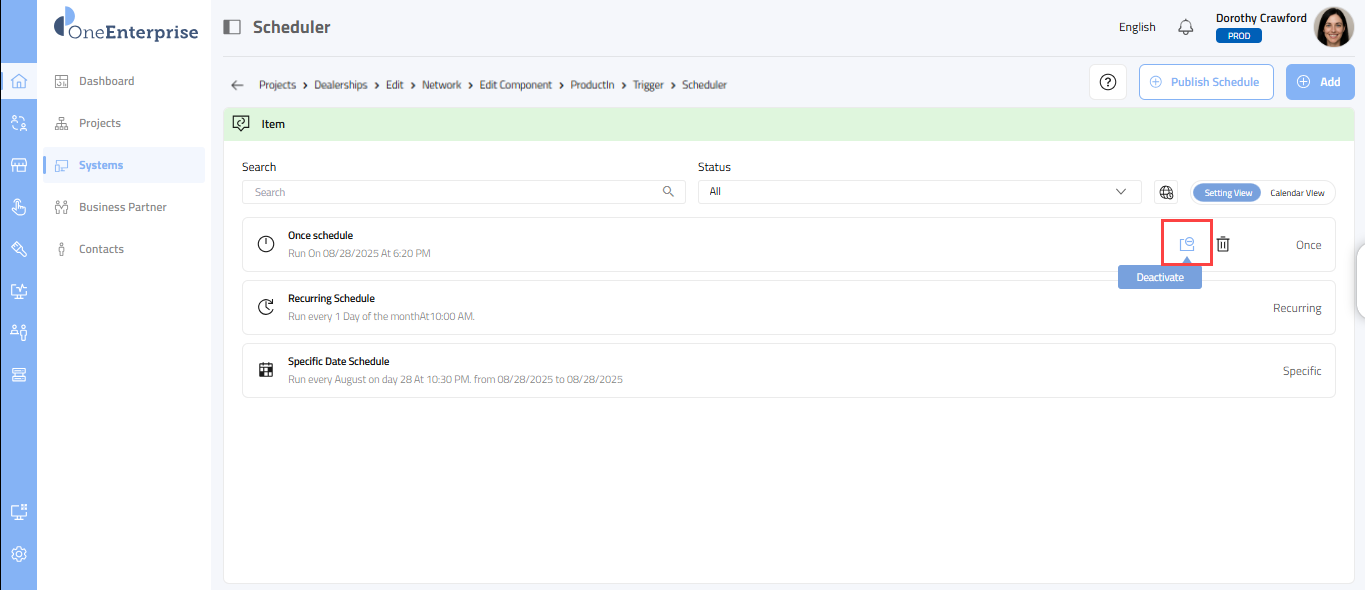 - Upon clicking the icon, the respective schedule will be deactivated.