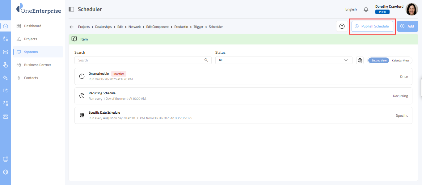 - Click on the Publish Schedule button. Please note that the deactivated schedule will not be published. Only active schedules will be published.