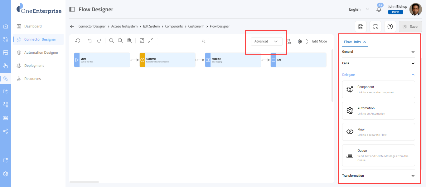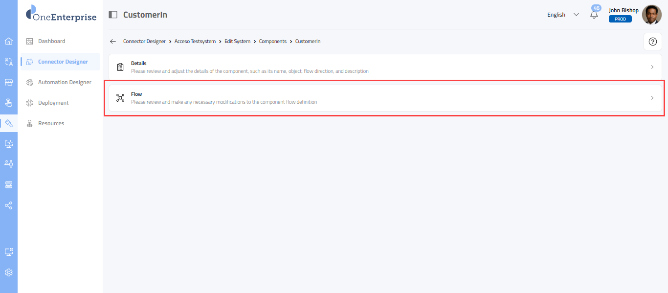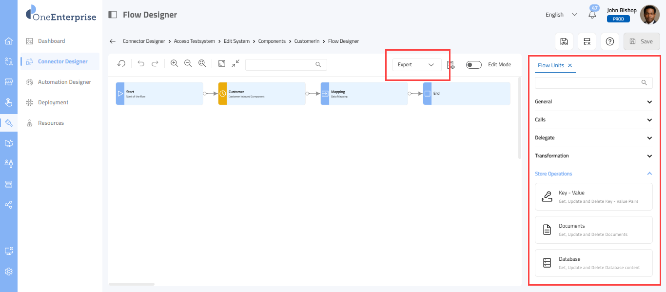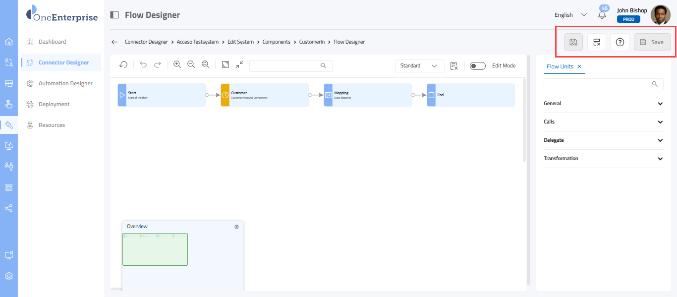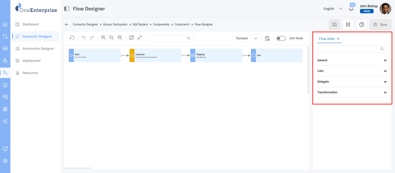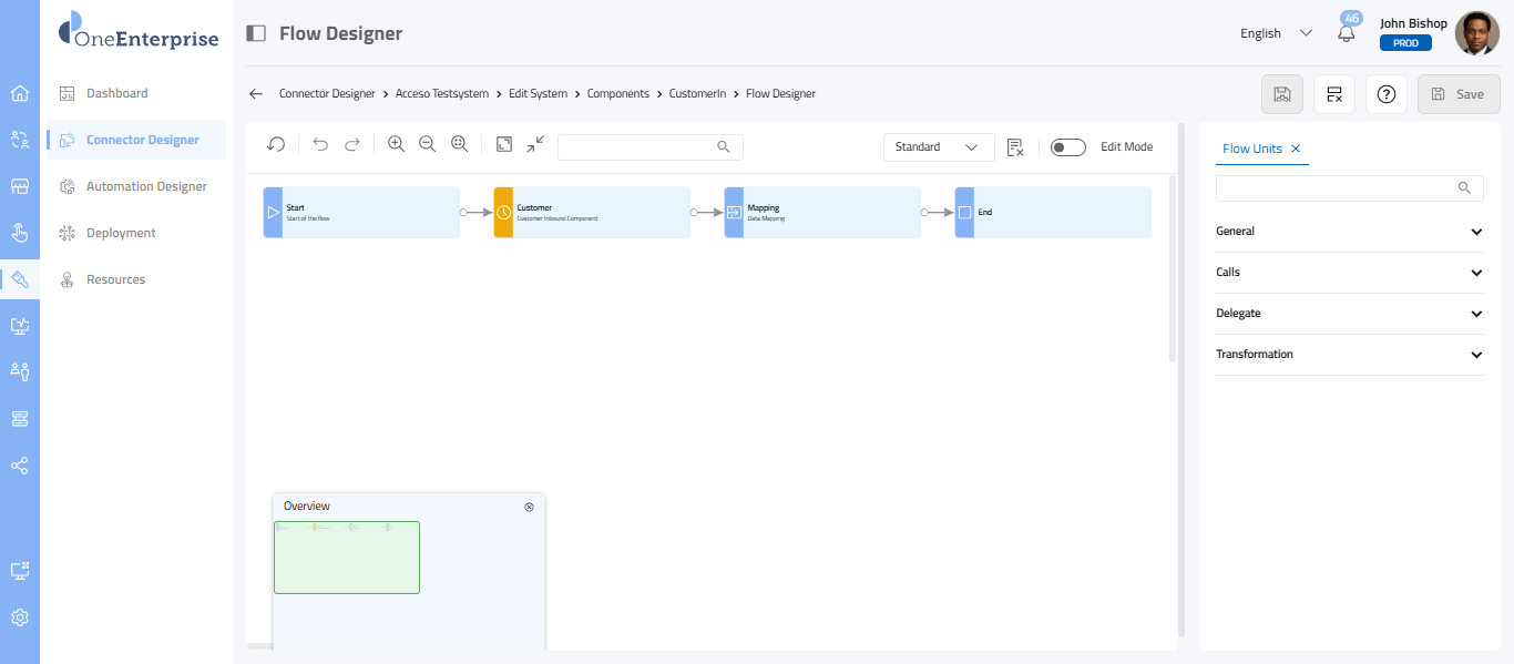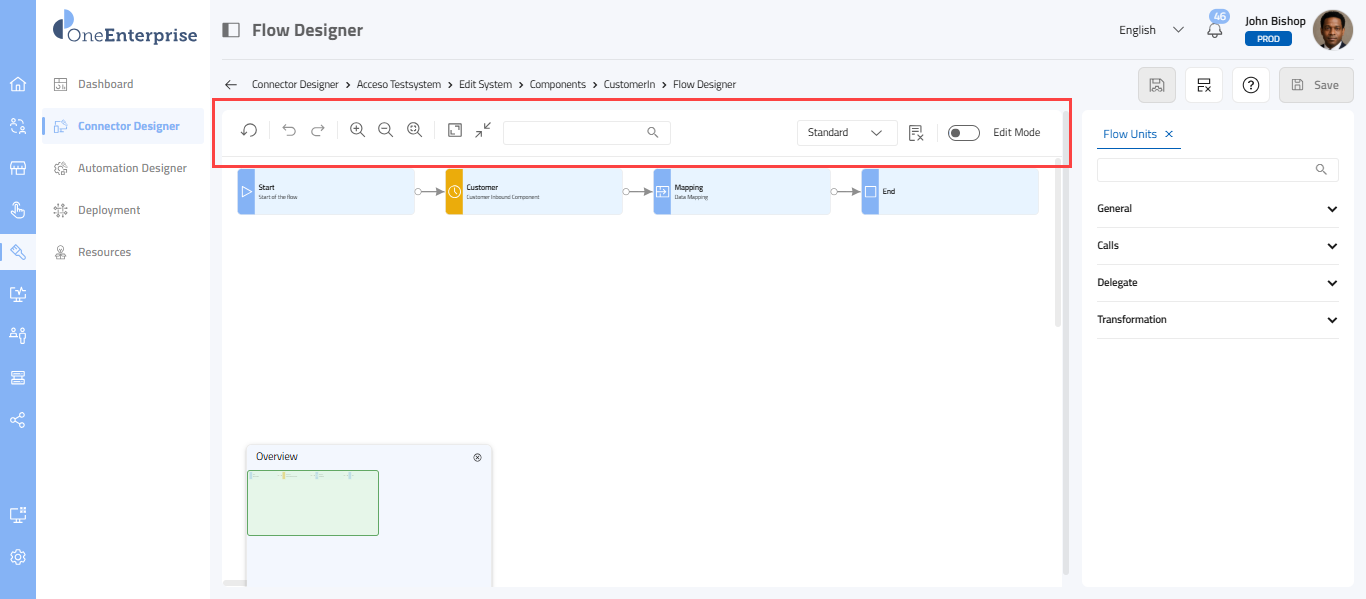 The flow editor feature in OneEnterprise enables you to visually modify and refine component flow through an intuitive interface. This functionality permits direct interaction with the flow structure of the component. The flow editor offers a range of tools and interactive elements for editing the flow, including drag-and-drop units, toolbar controls for navigation and zoom, and configurable unit settings, thereby facilitating the customization of automation behavior in response to changing business requirements. Here’s what the flow editor typically involves: