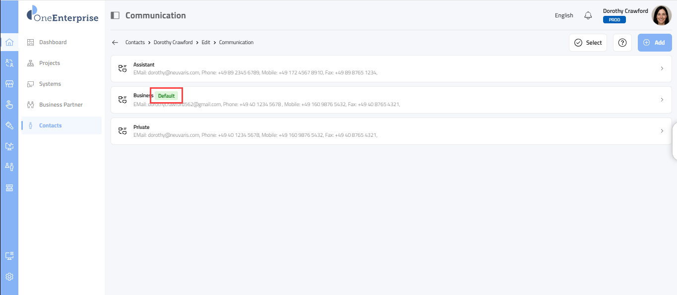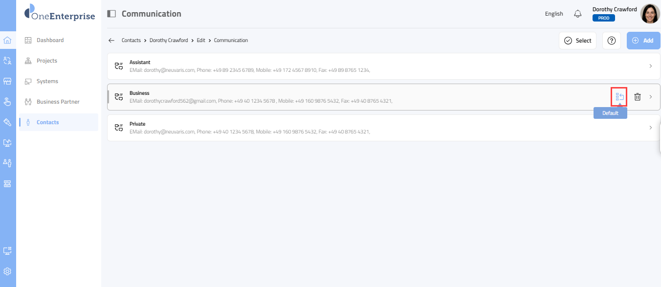 - The Default button allows you to designate a selected communication as your default communication for your Contact.
