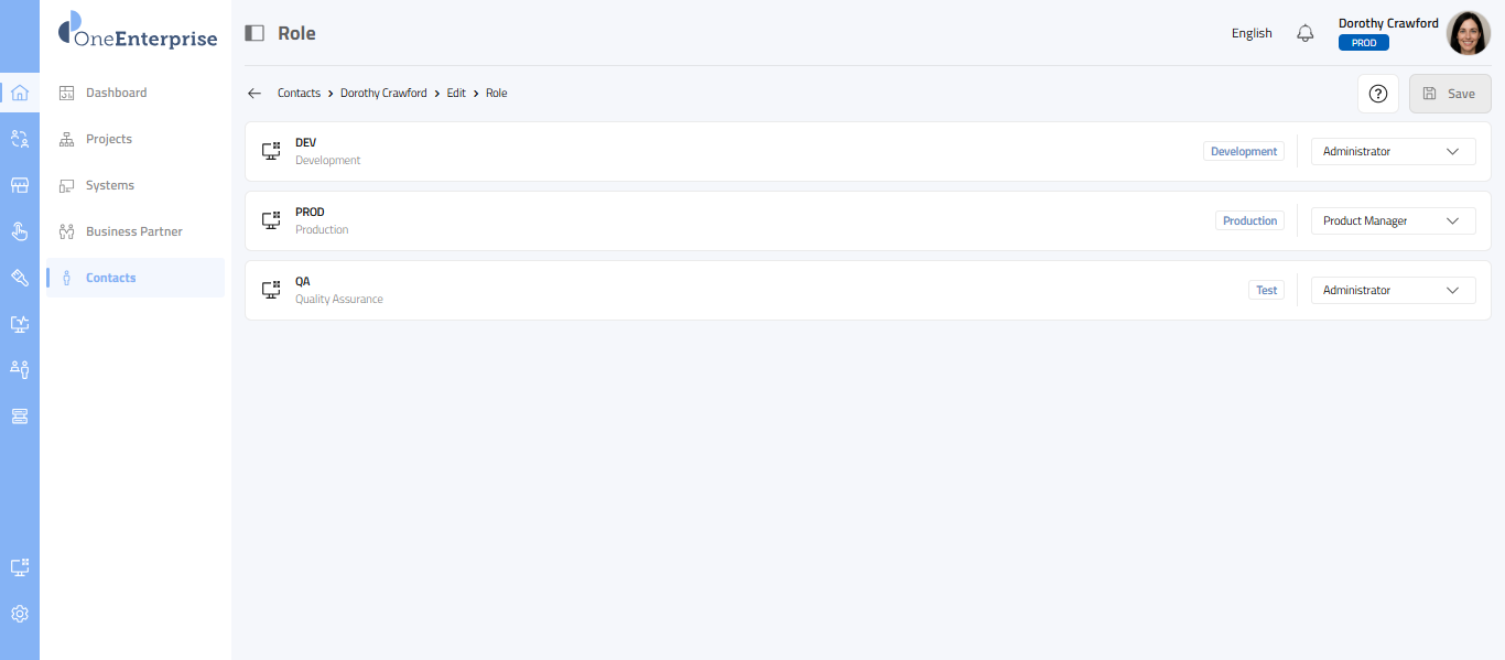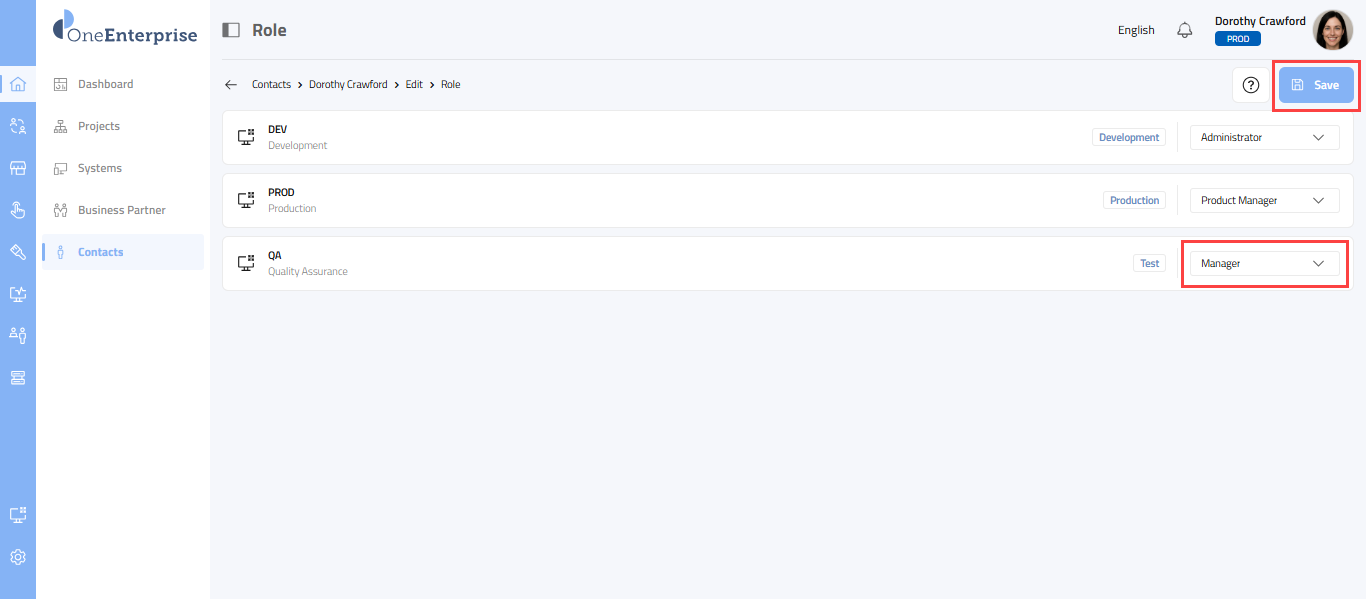 - A list of roles is provided in the drop-down options. If you want to restrict a contact's access to a specific environment, simply select the No Access option from the drop-down menu.