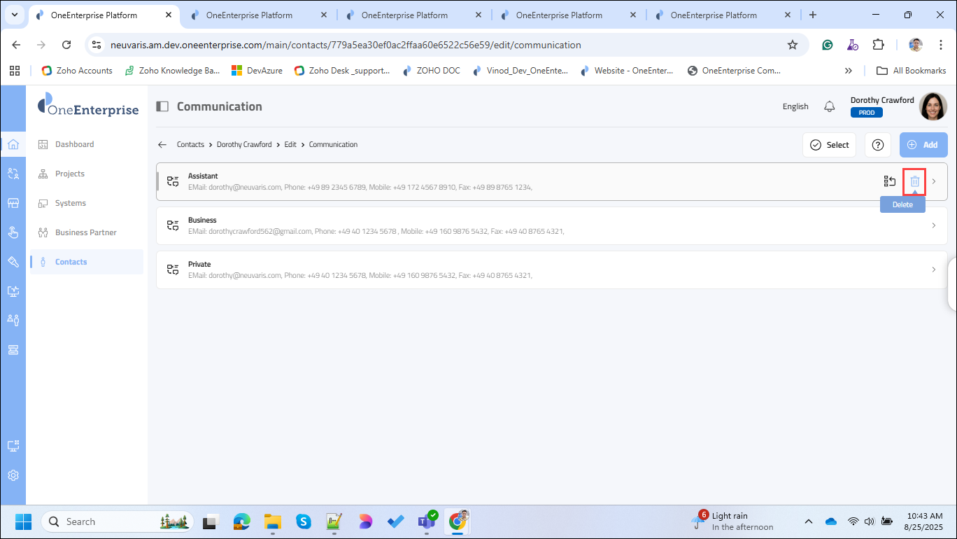 - Once you hover the mouse on the communication band, the Delete icon will appear on the row.