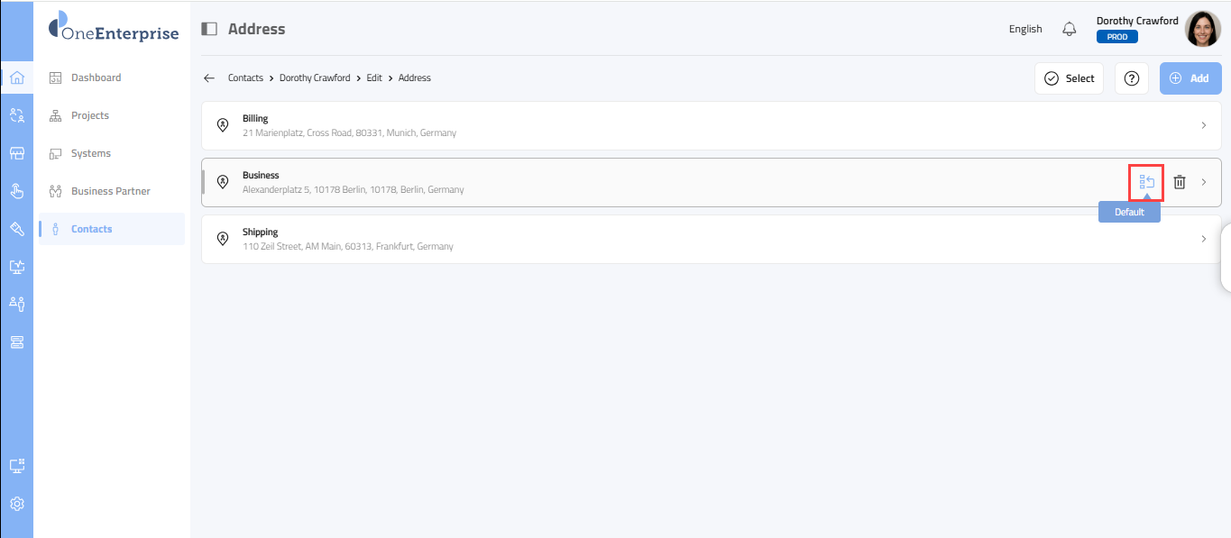 - The Default icons button allows you to designate a selected address as your default address for your contact.