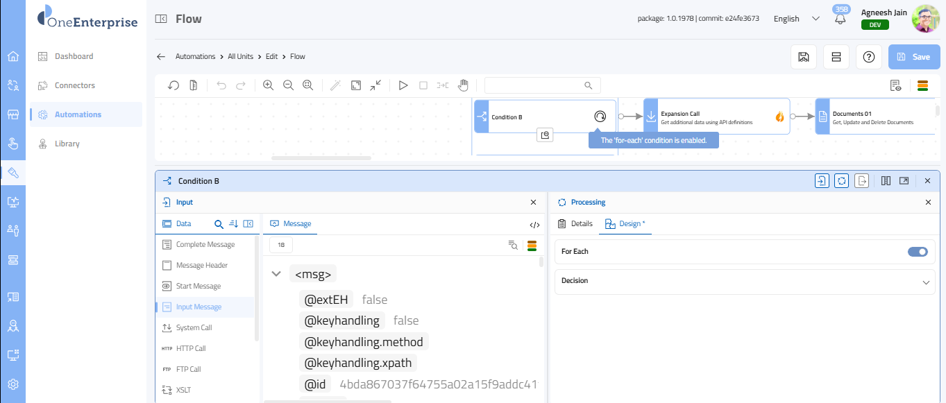 In a Decision Unit, the For-Each condition is used when you want to evaluate a rule against each element of a collection (array/list) instead of evaluating the entire message at once. It combines looping behavior with conditional logic.