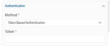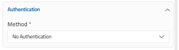 - Once expanded, the Method drop-down field will be displayed. Based on the selected authentication from the drop-down, the corresponding fields will be displayed. The following types of authentication are supported: