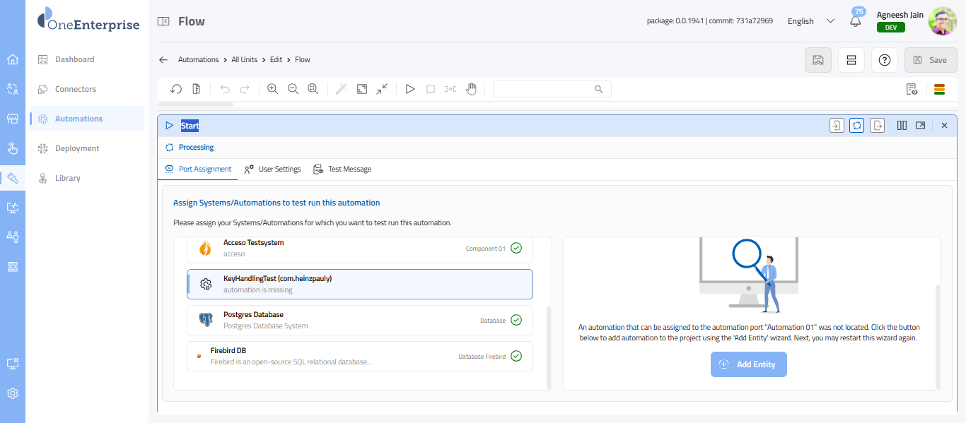 - Please note that if you have not assigned any system to your automation, the second section will be empty with an Add Entity button.