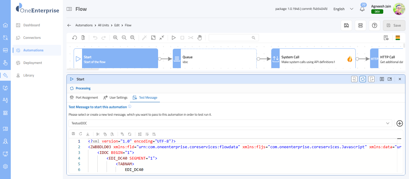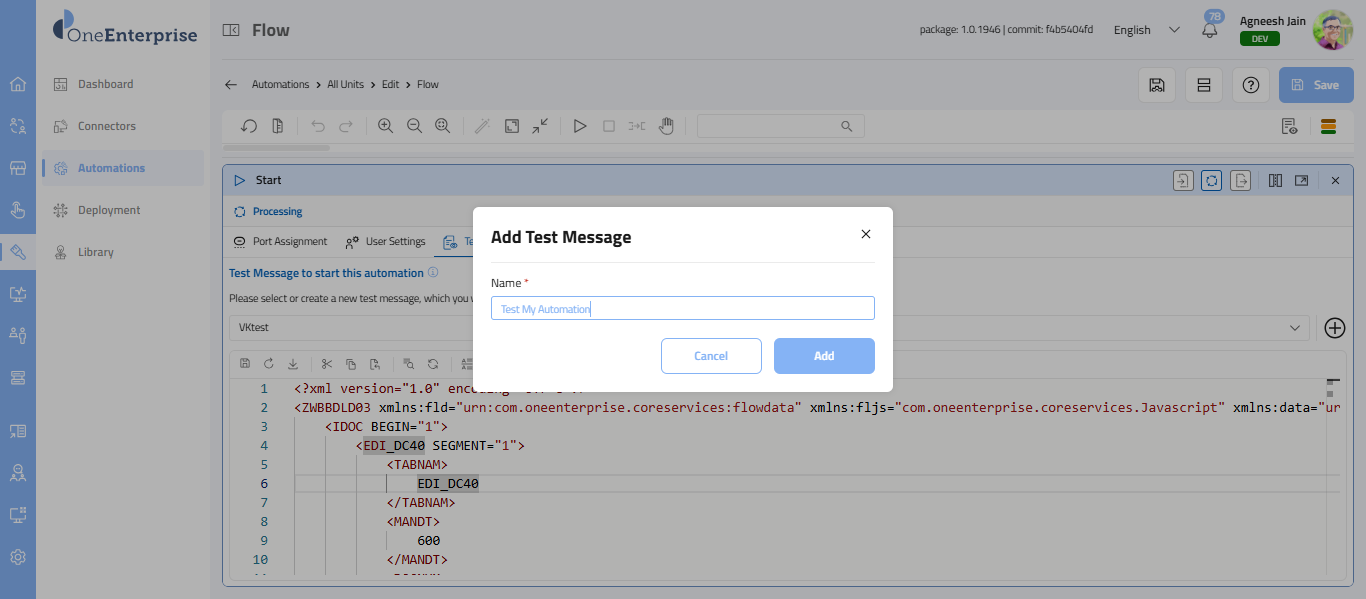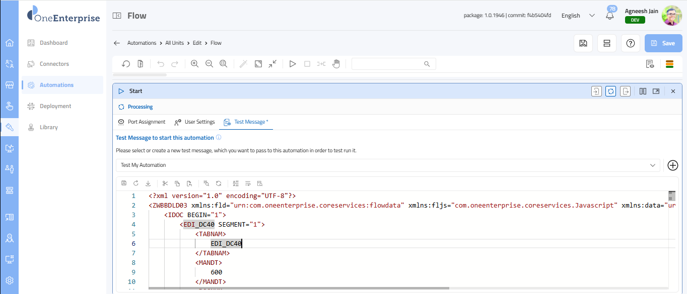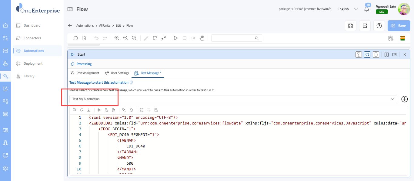This section explains how to work with the XML message of your automation. This message allows you to test your automation. The Test Message (XML) is a sample input payload used to test and simulate the flow execution during development. It allows you to validate how the flow behaves without needing an actual external trigger.