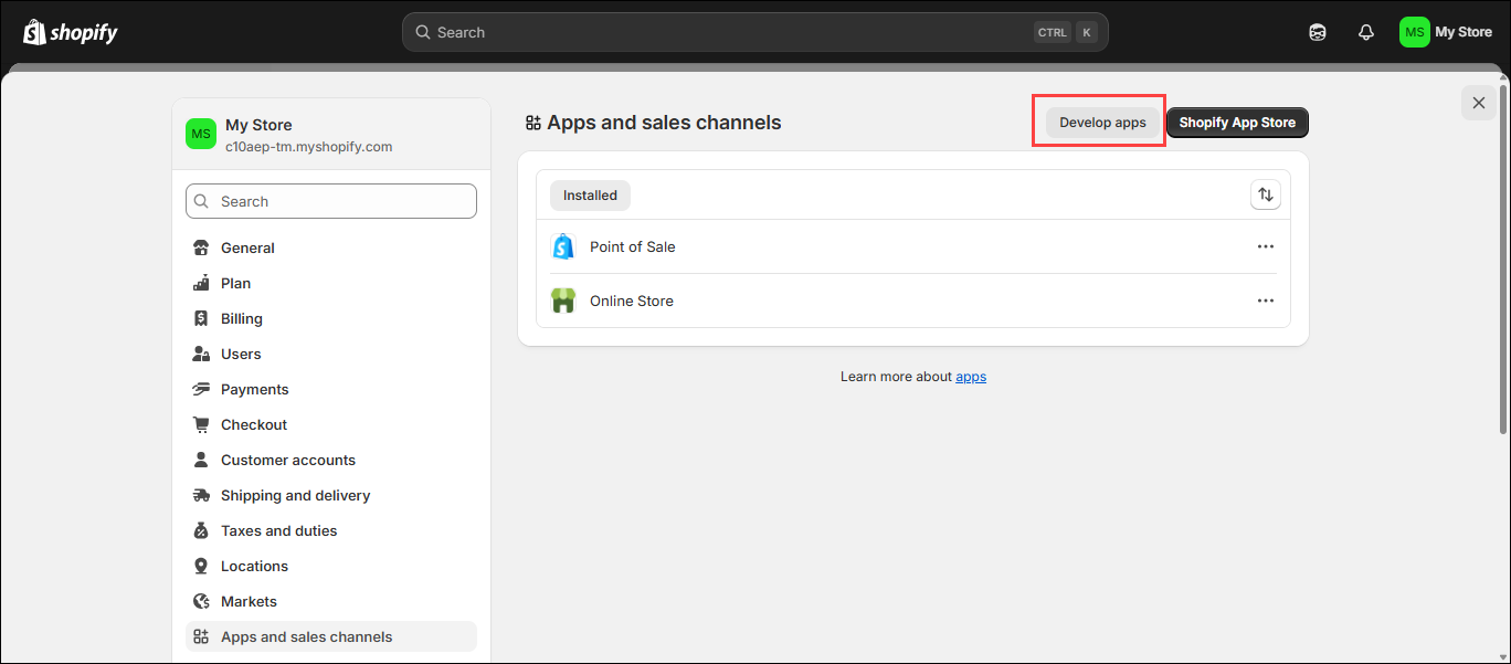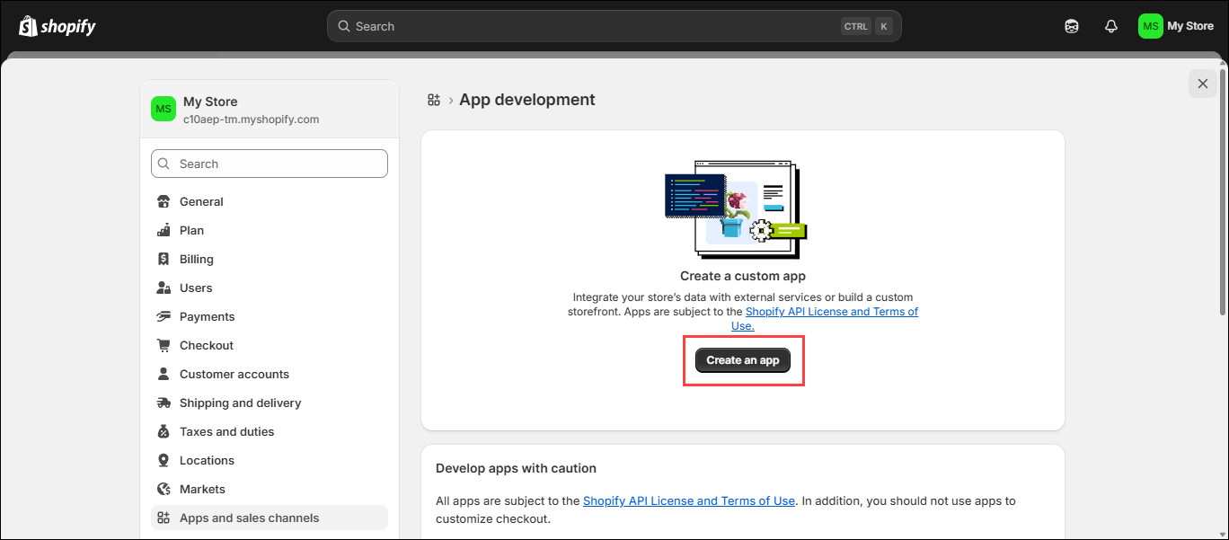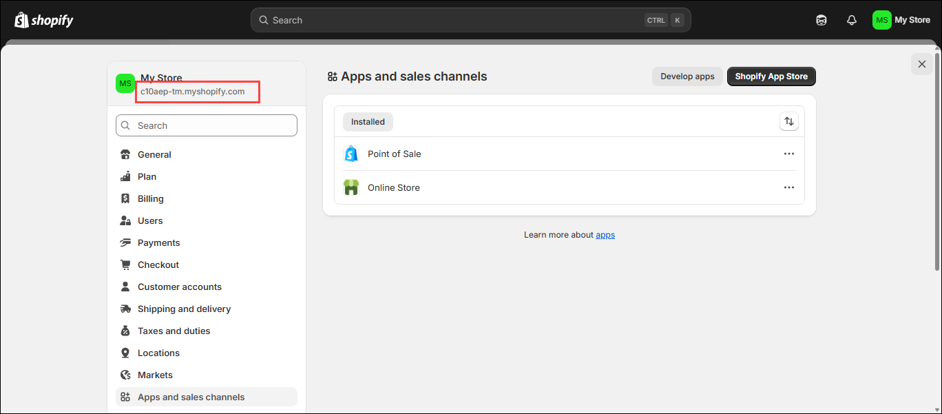 - Application Server URL: Copy your application server URL as shown on the screen. In this example, your application server URL would be store-charli.myshopify.com. Do not copy the complete URL.