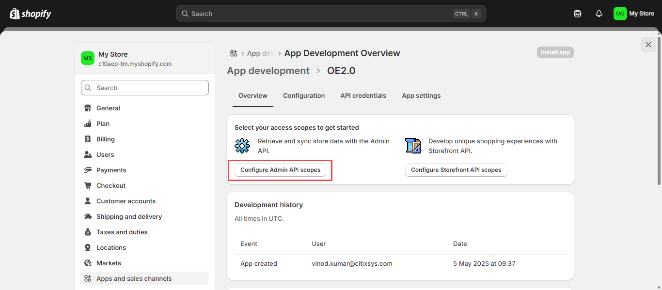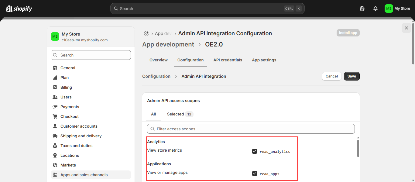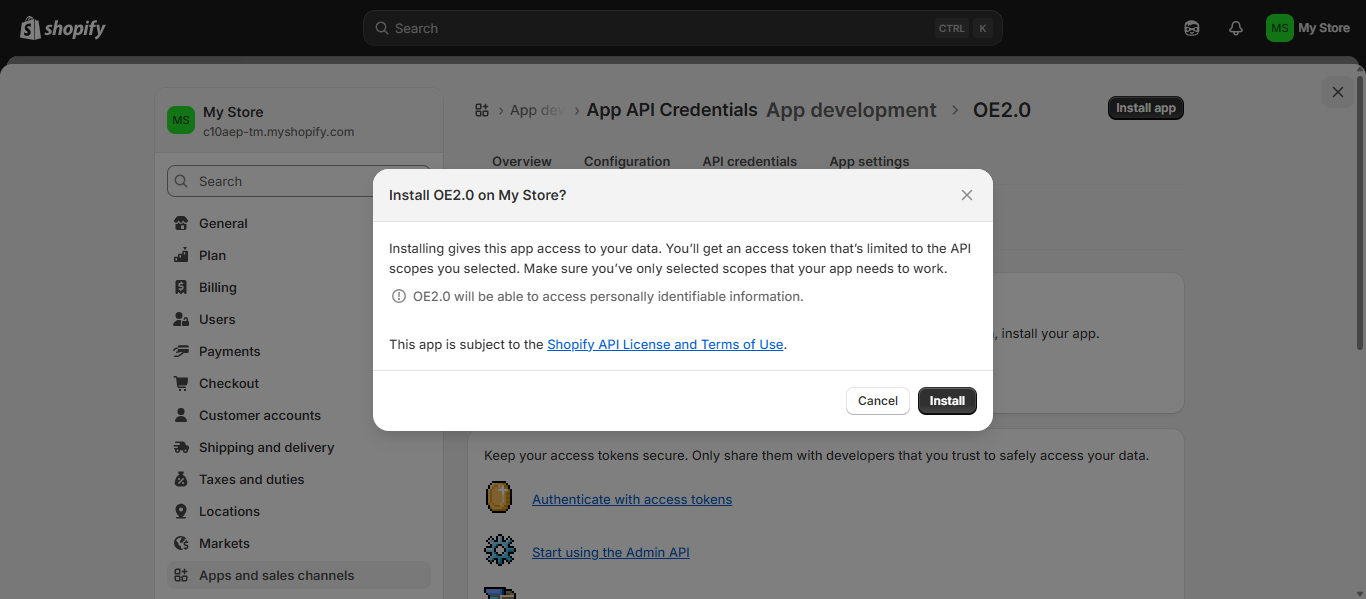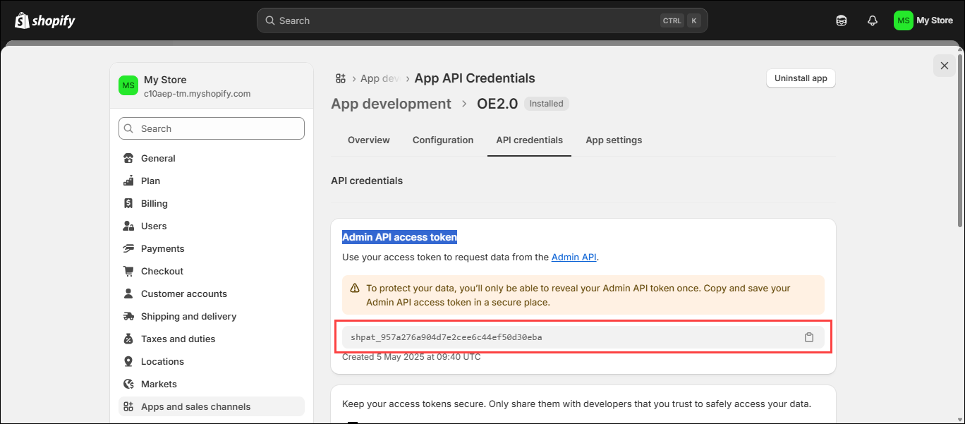 - Copy the token and save it on your local machine. You must use this token as a password in the Password field when creating a Shopify system in the OneEnterprise portal.