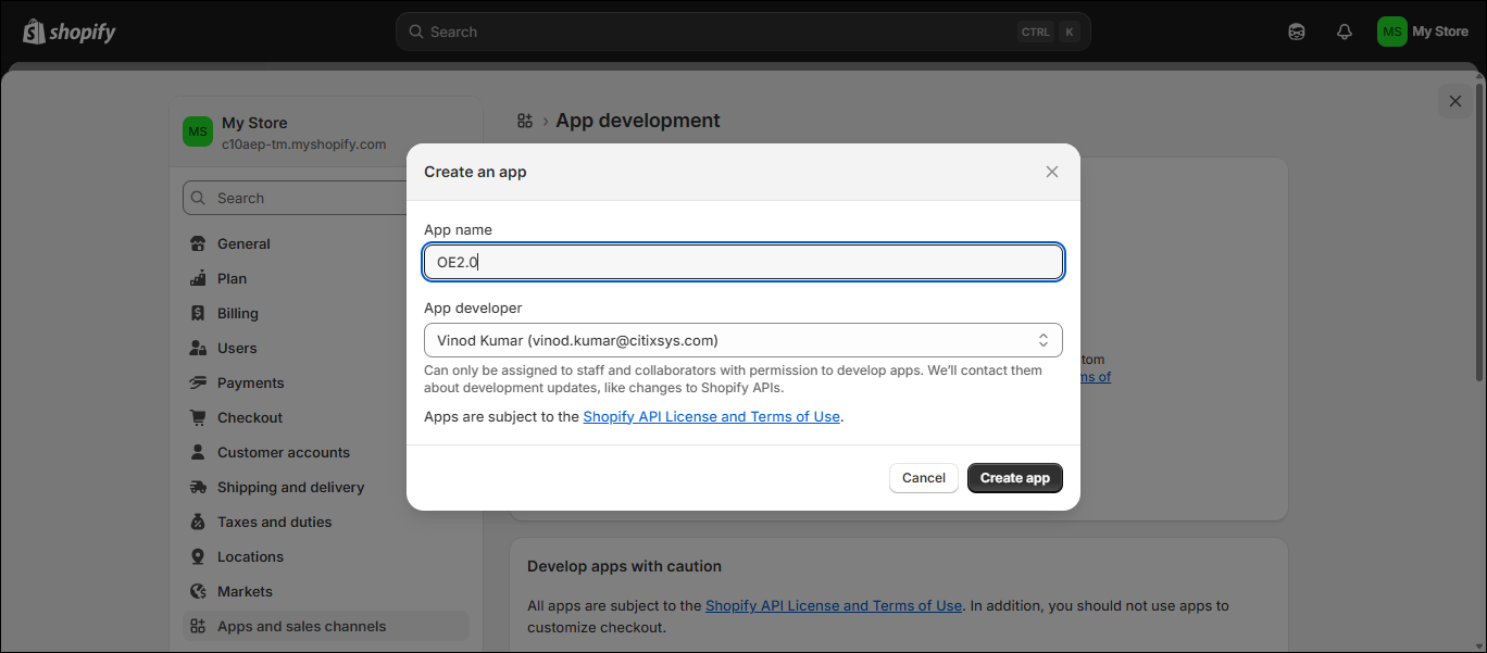 - On the Create an app pop-up screen, enter the app name in the App name field.