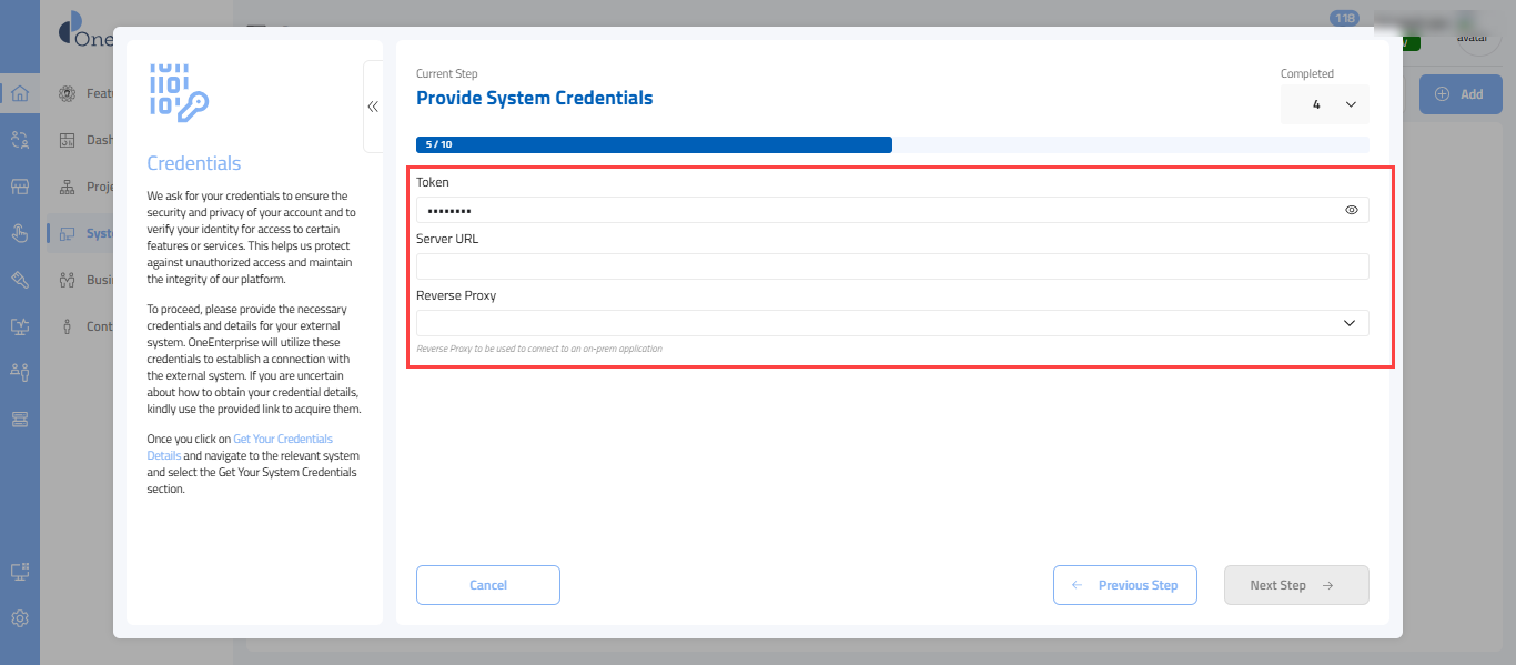 The credentials are required to set up a system. First, please copy all your credentials. Then, use these credentials while creating a system in the OneEnterprise portal:
