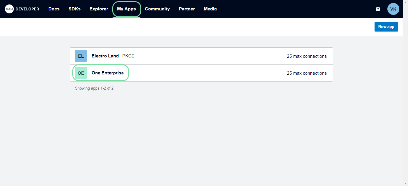 - Click on the My Apps tab as shown on the screen. For example, the Electro Land and One Enterprise apps are already created in the screenshot below.