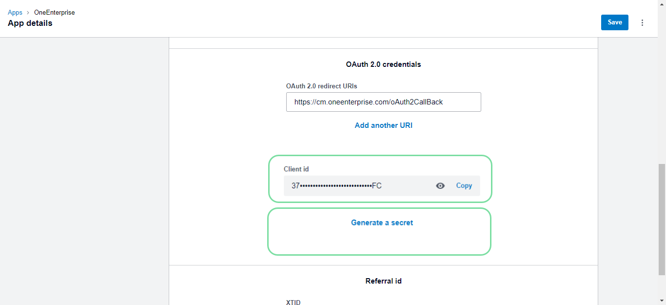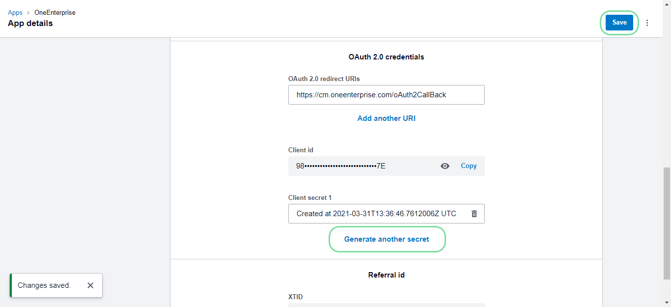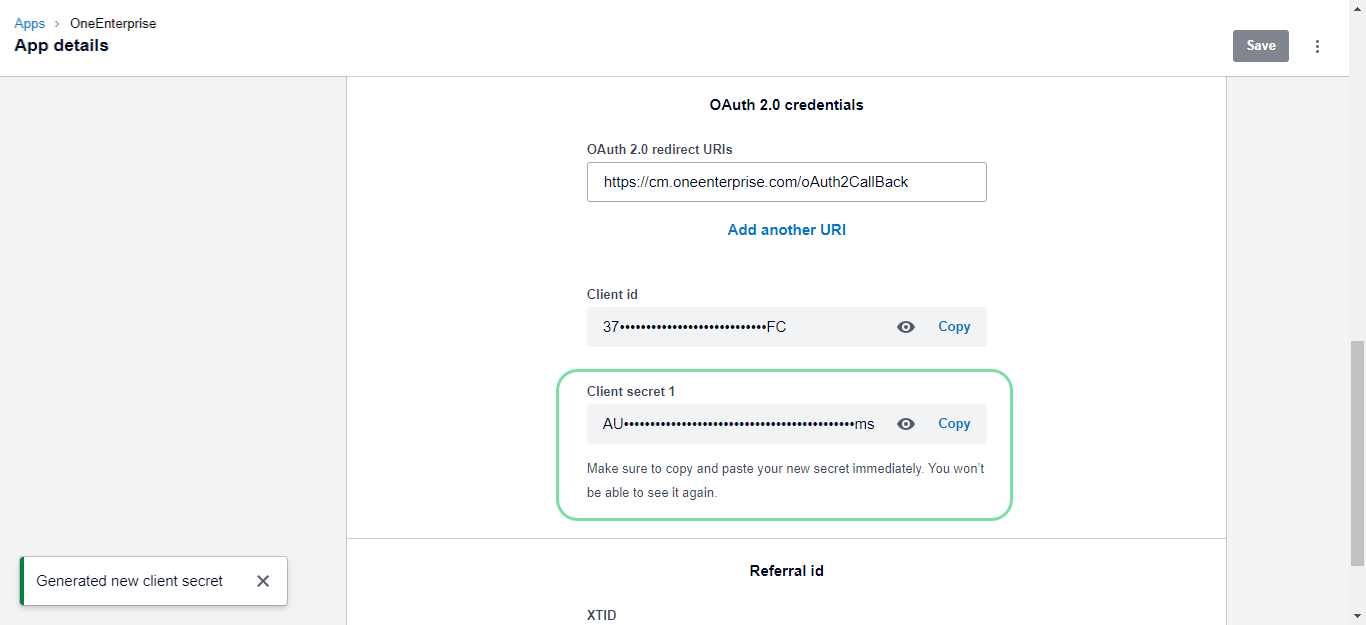 - Click on the Save button to save your credentials. Once you click on the save button, the client secret is no longer visible to you. Instead, you will see the date and time you created the client secret in the clientsecret field.