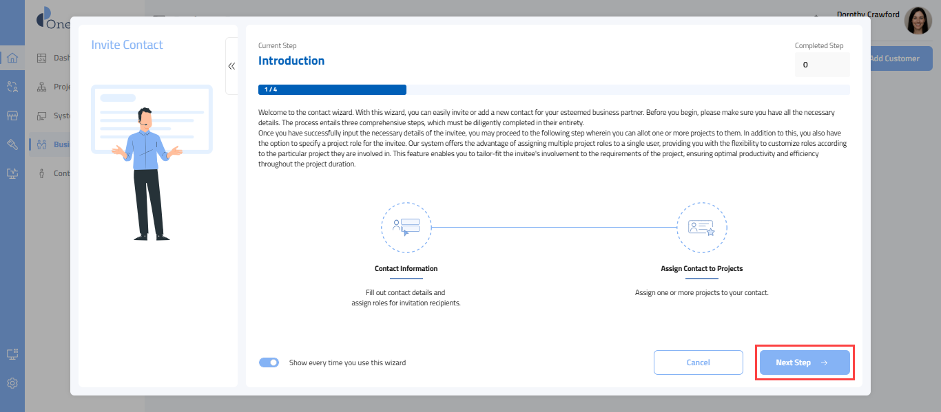 On this screen, you need to assign the project to your contact. However, it's not required to assign the project here. You can add a contact and send the invitation without assigning the project to your contact. Additionally, you can go to the Project module at any time to invite team members to any project.