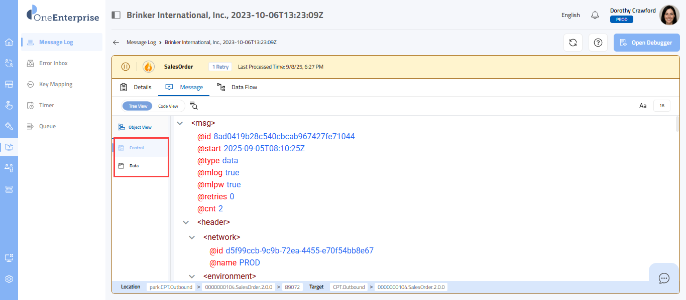 - Within the tree view, you can switch between the Control and Data views to see the message. The Control view displays the details of the message headers, while the Data view displays the details of the message elements.