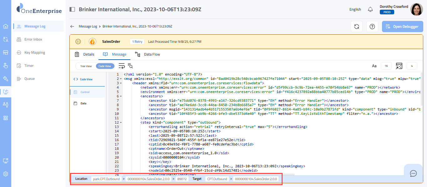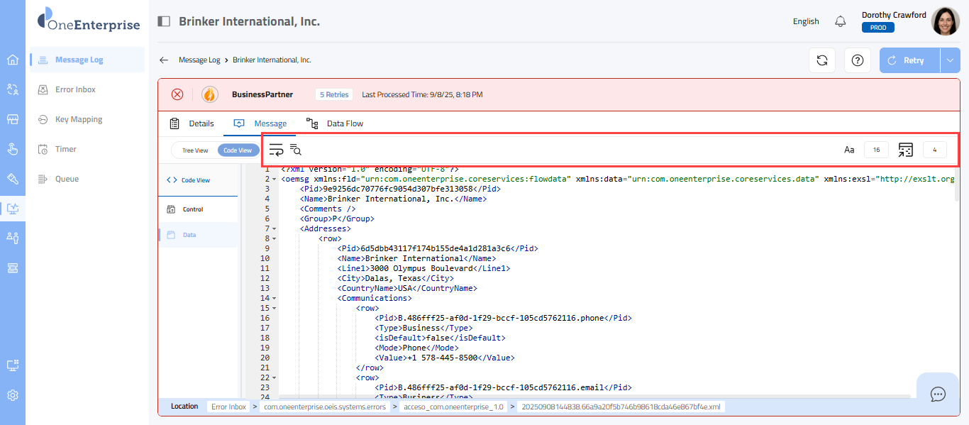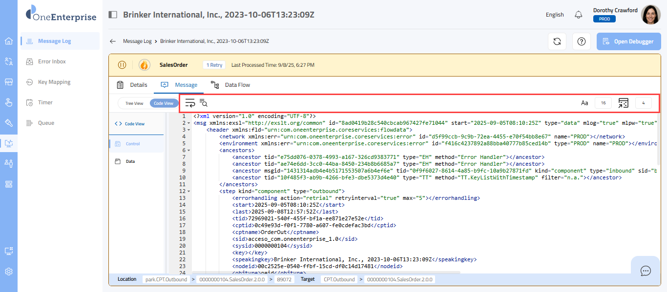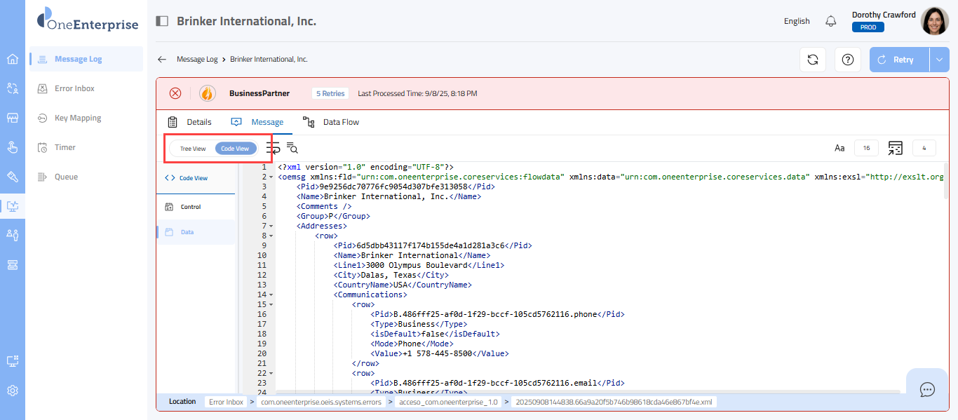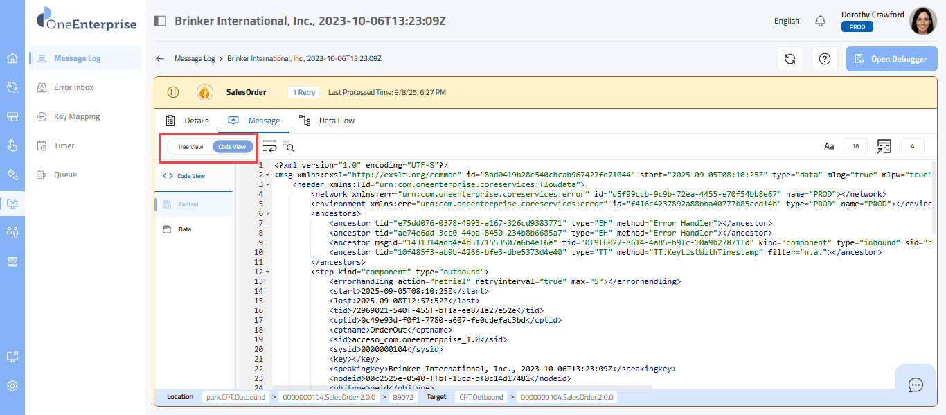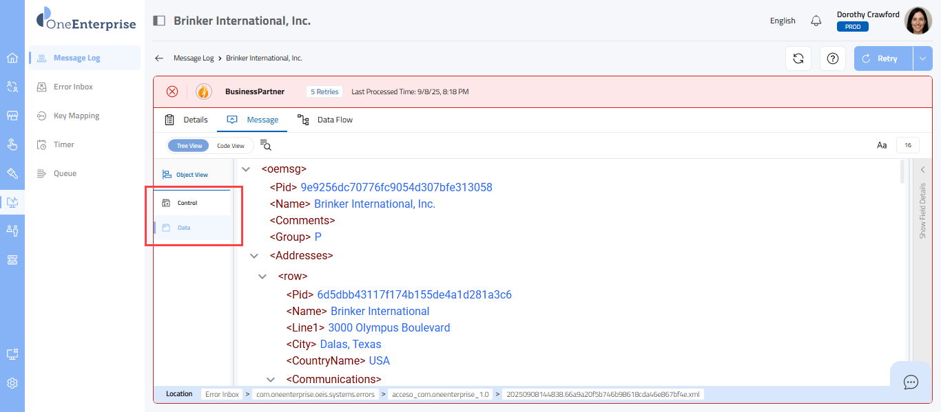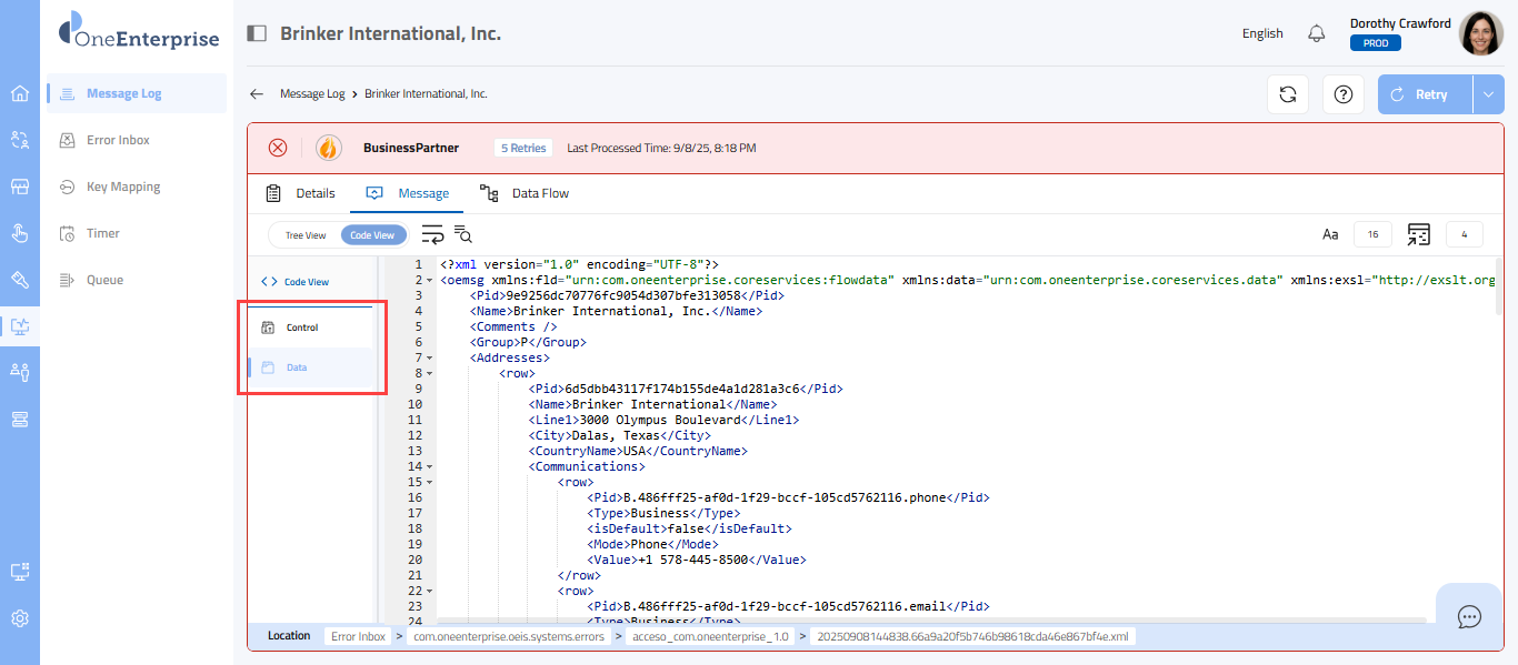 - Within the code view, you can switch between the Control and Data views to see the message. The Control view displays the details of the message headers, while the Data view displays the details of the message elements.