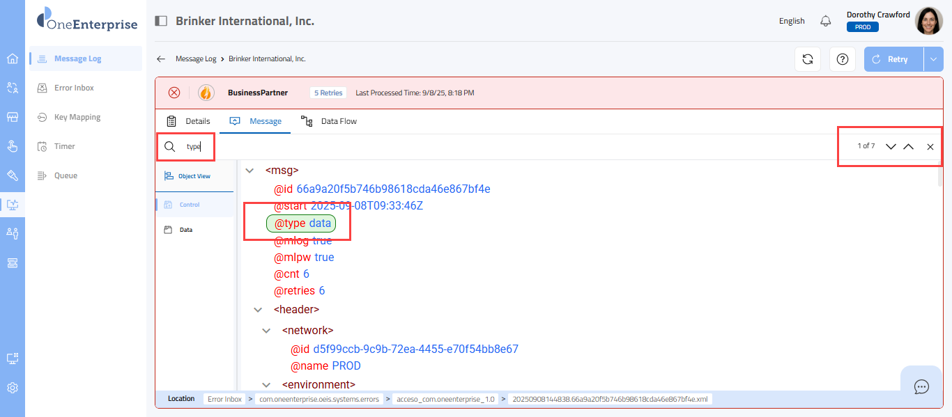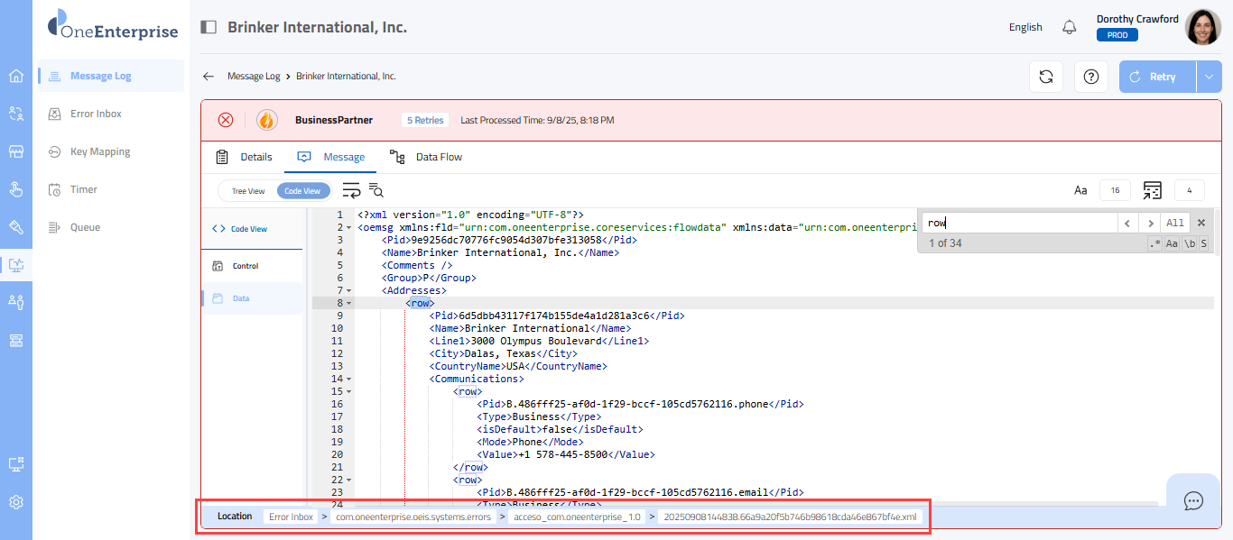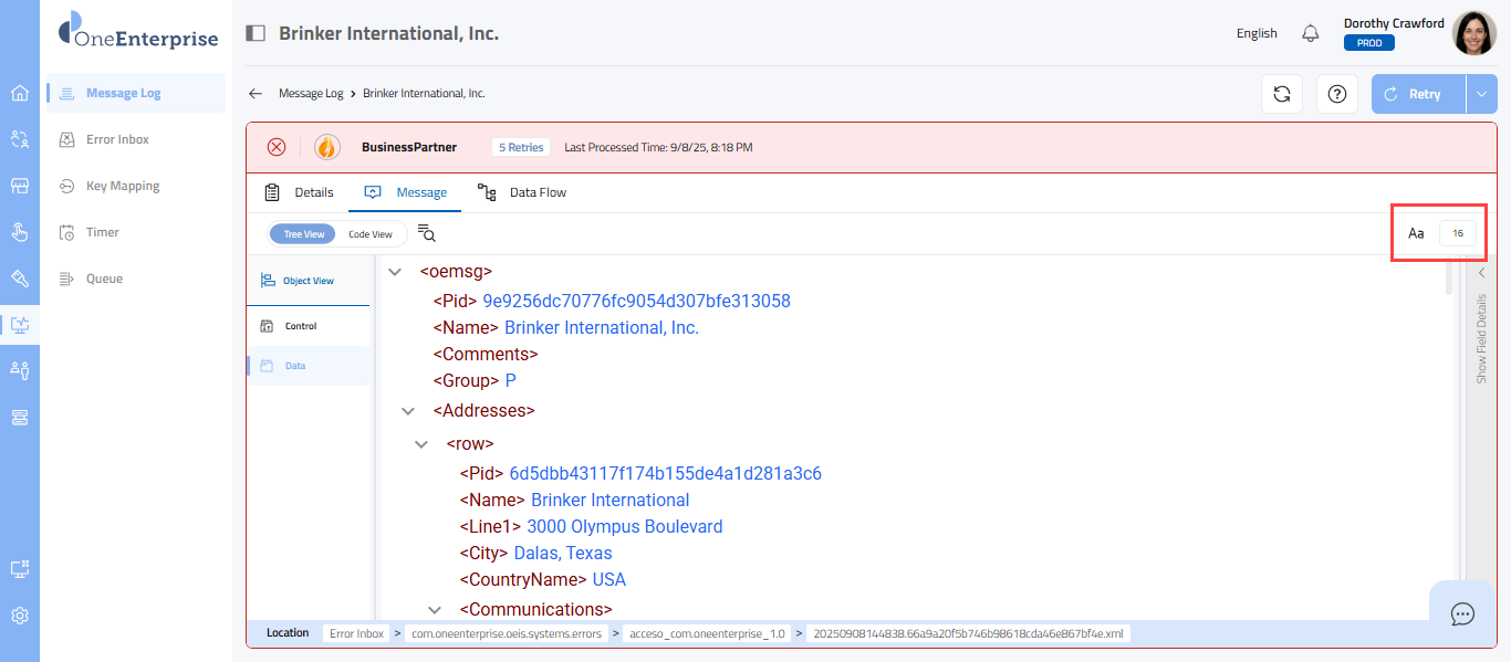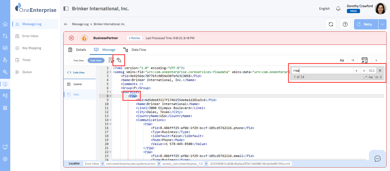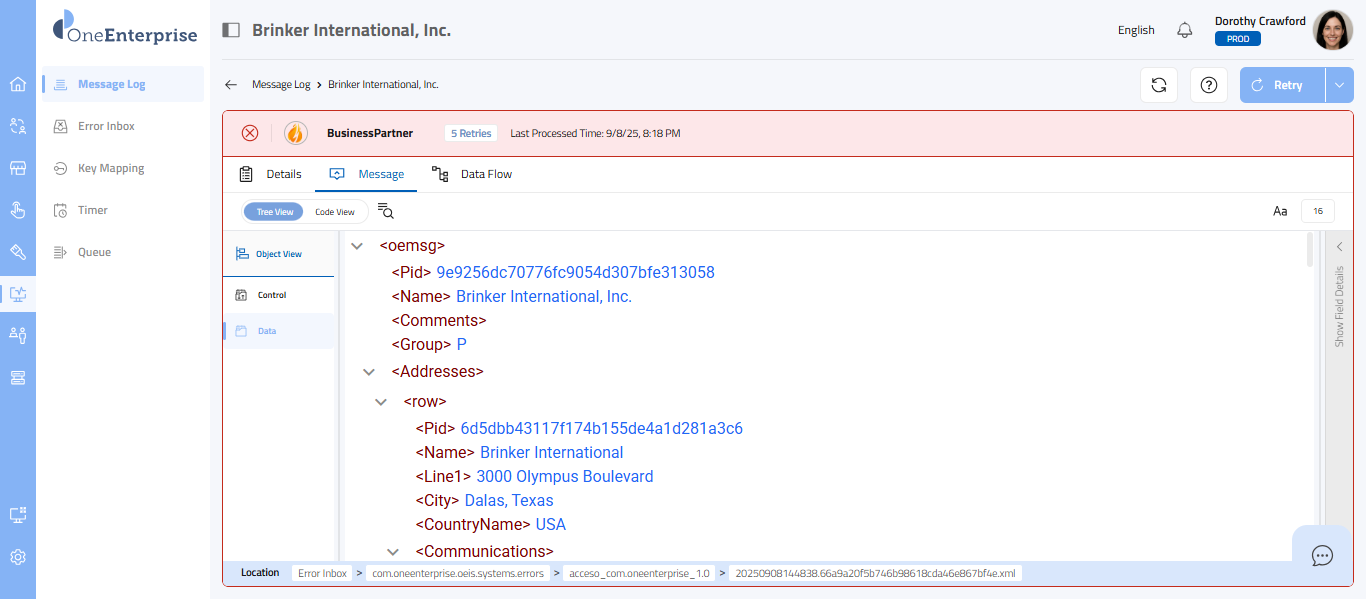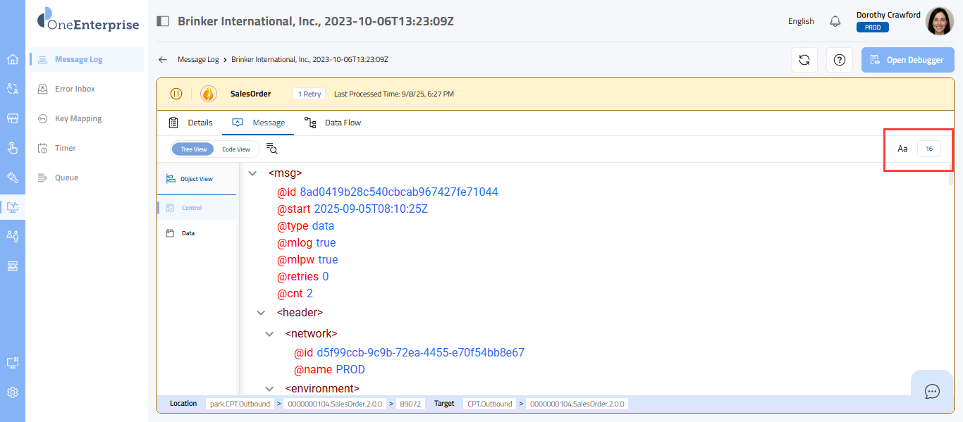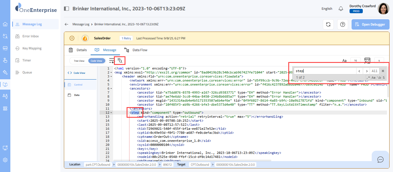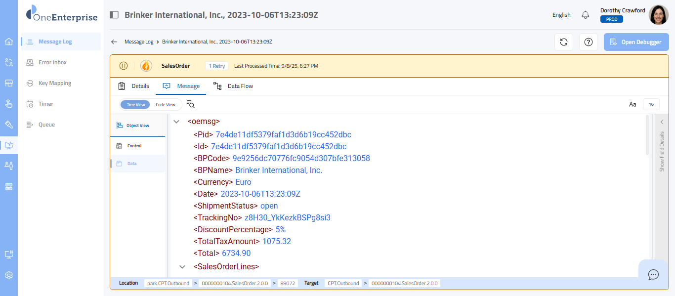 - Within the code view, you can switch between the Control and Data views to see the message. The Control view displays the details of the message headers, while the Data view displays the details of the message elements.