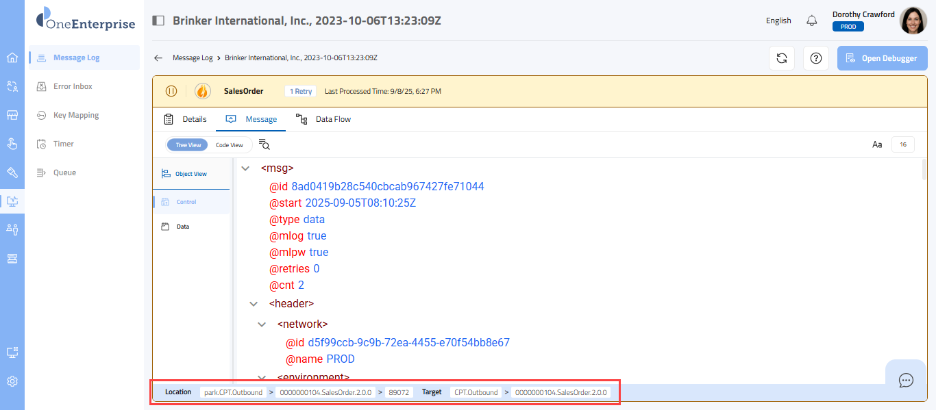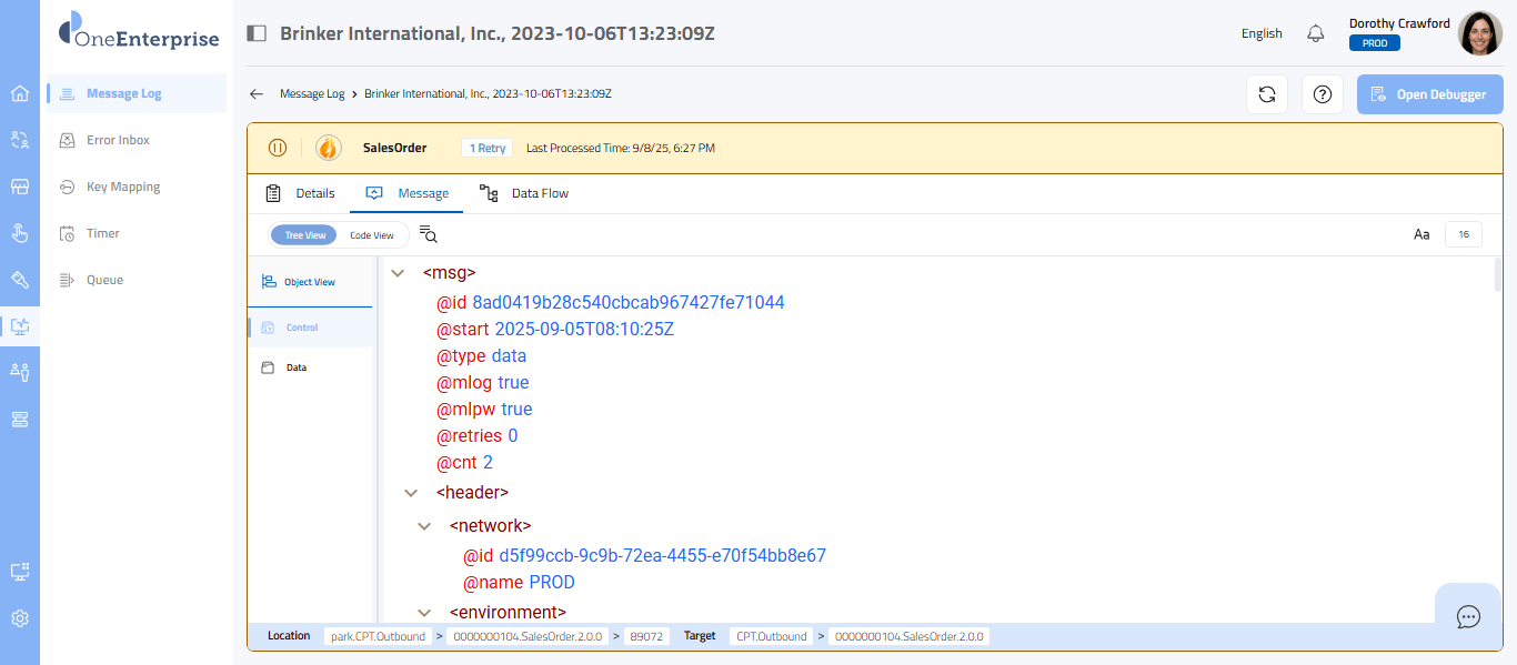 - By default, the tree view with the Control tab will be open, displaying the message details.