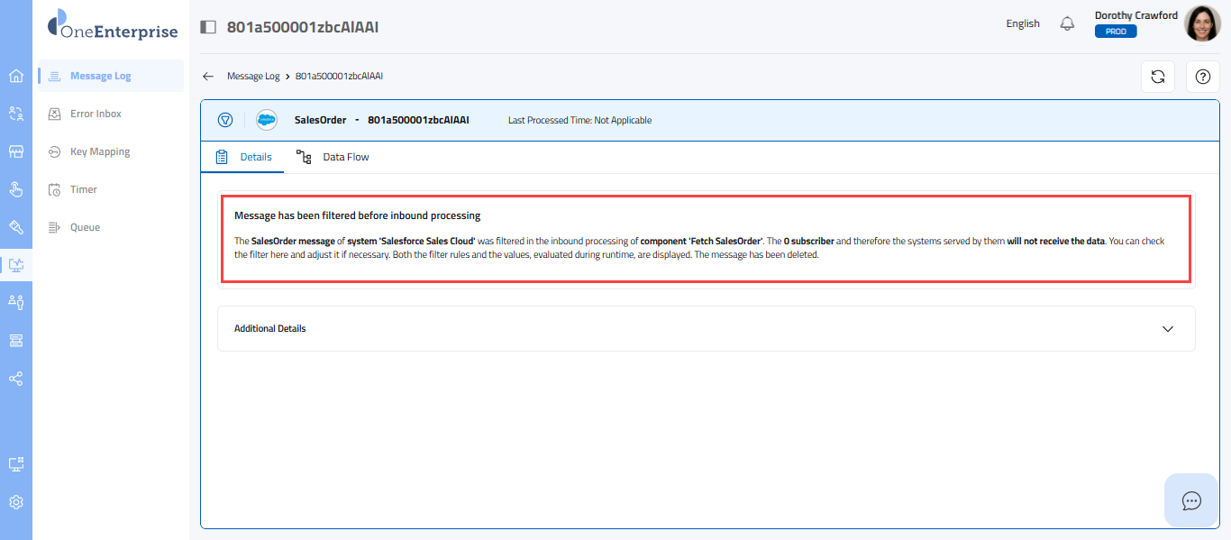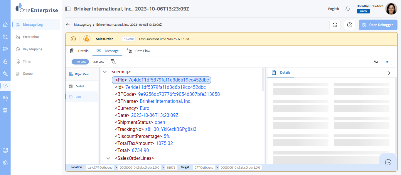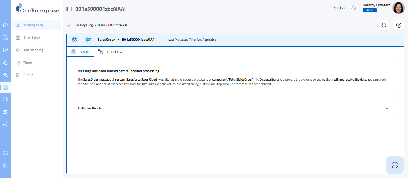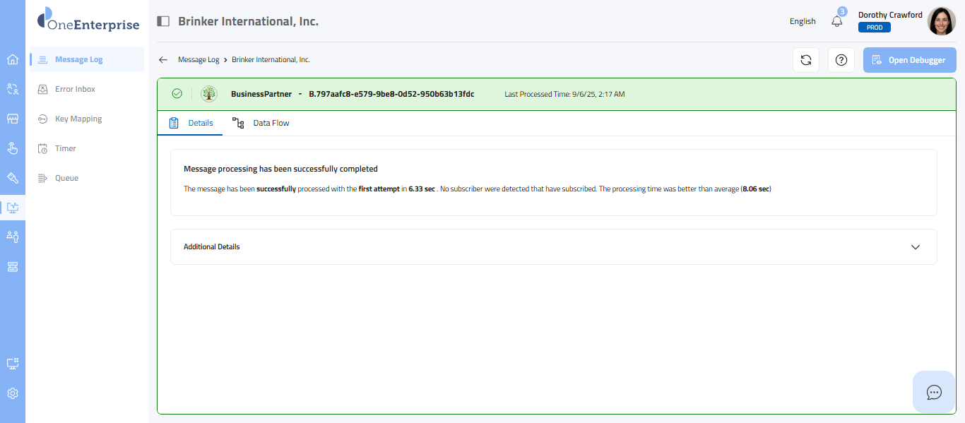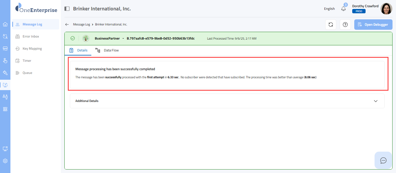 This part of the screen provides you with detailed information about each message. You can review this section's technical details, message details, and data flow. Each message type will provide its details. Depending upon the message type, the details sections may vary.