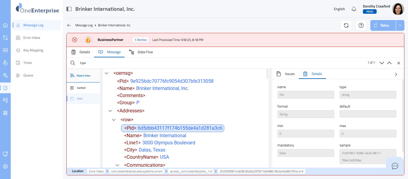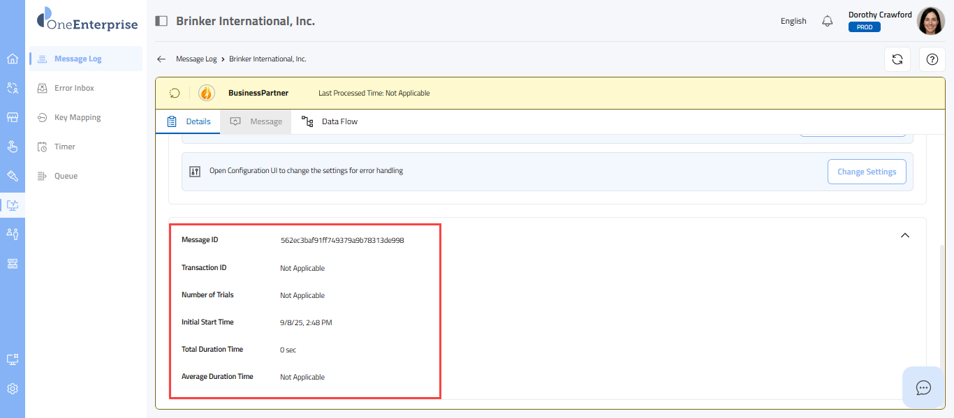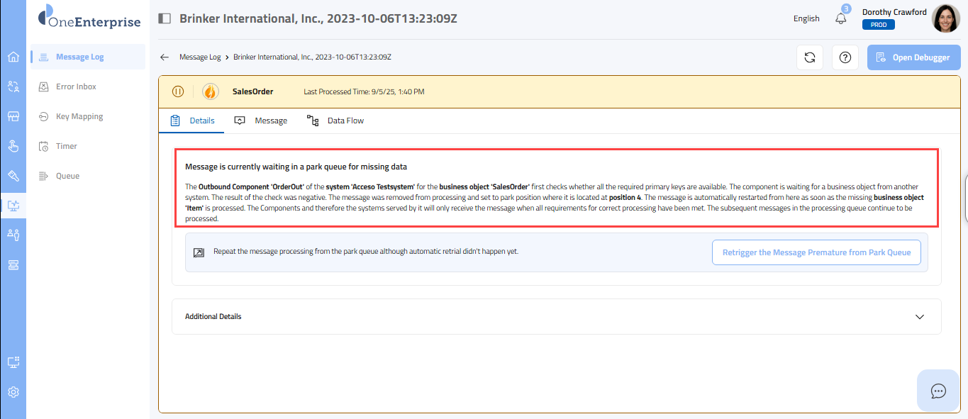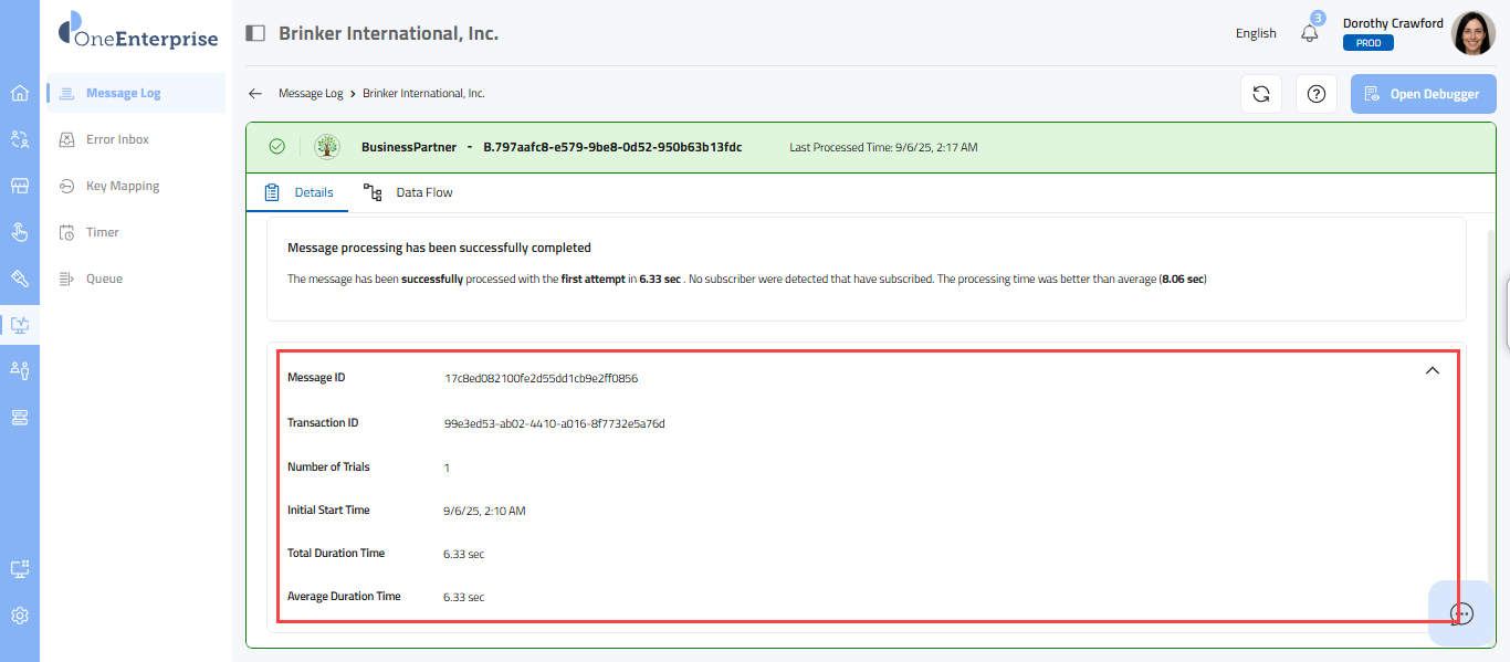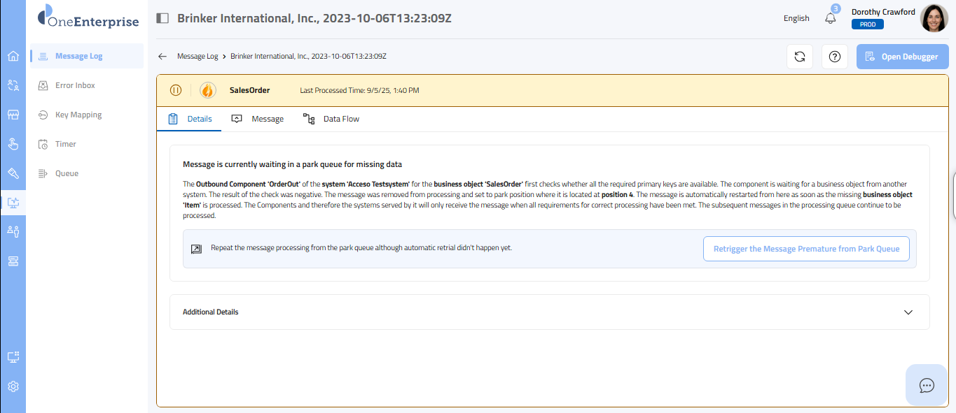 This part of the screen provides you with detailed information about each message. You can review this section's technical details, message details, and data flow. Each message type will provide its details. Depending upon the message type, the details sections may vary.