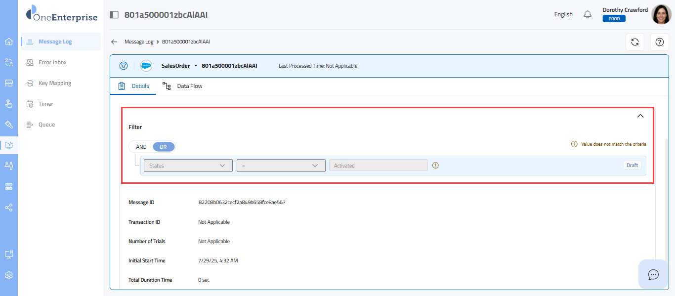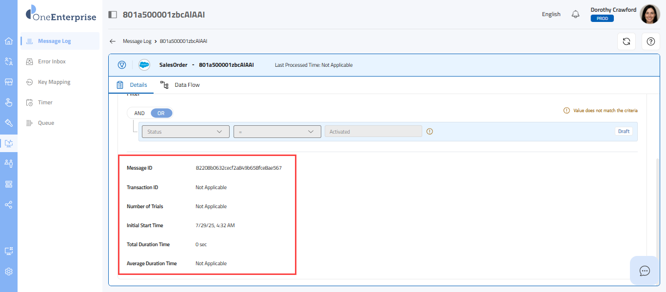 - To view the filtered message log, click on the filtered message band. Upon clicking the band, you will see the message details. By default, the Details tab will open.