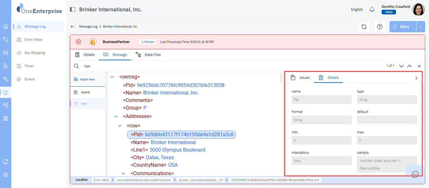 - The section appears with the details when you select any node in the message, displaying information such as name, type, format, and more.