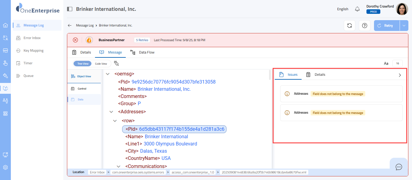 - Click on the issue band. Upon clicking the issue band, the message will scroll and display the parameter where the error is. By using this information, you can rectify the error in the message.