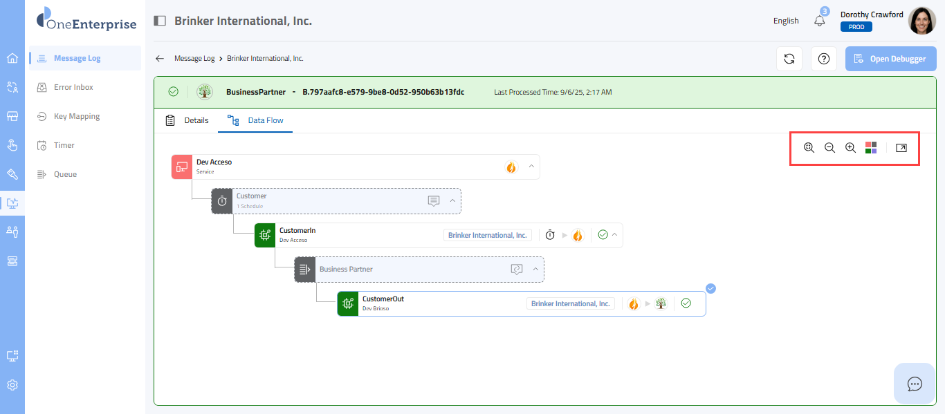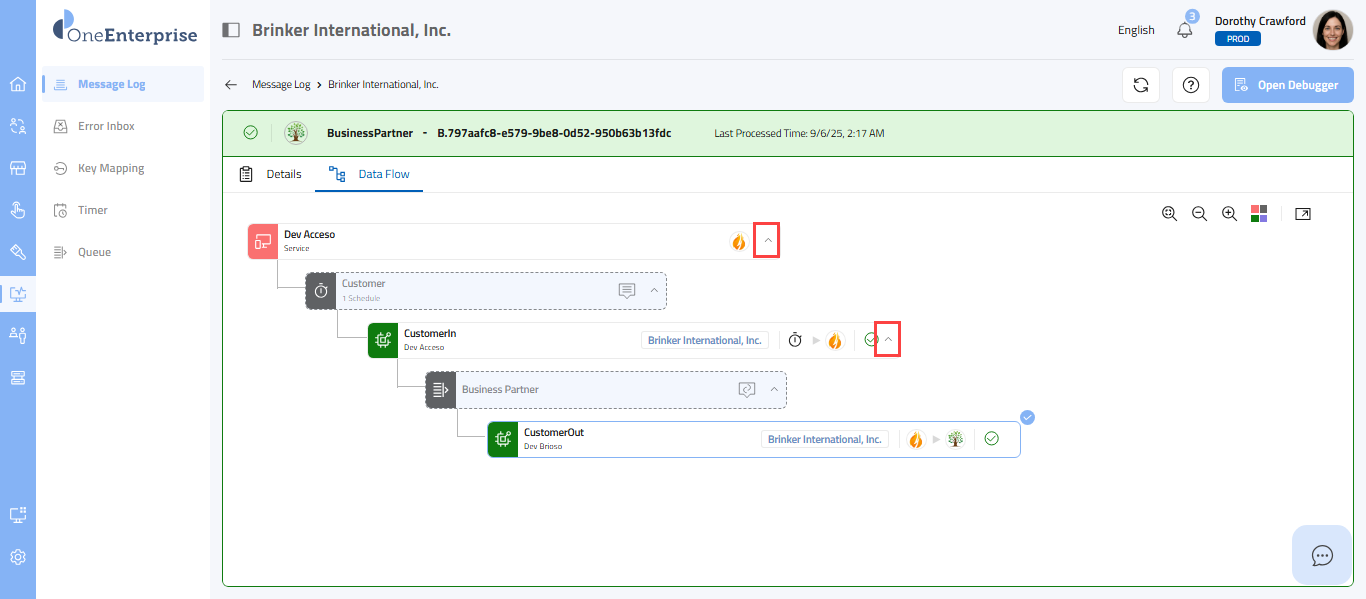 - Hover over the message and click on the Open Flow Debugger icon.