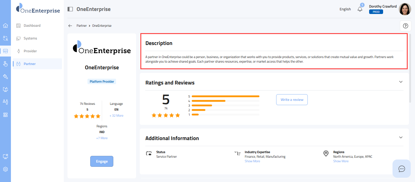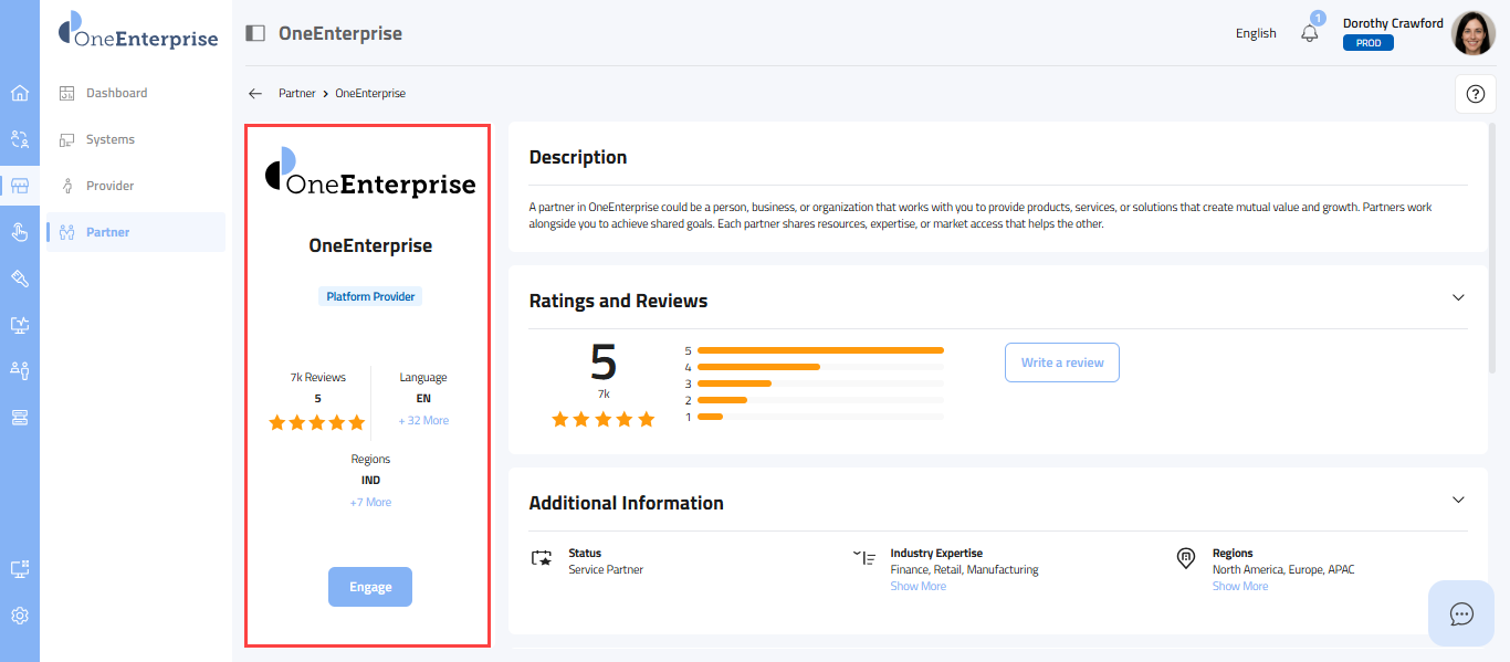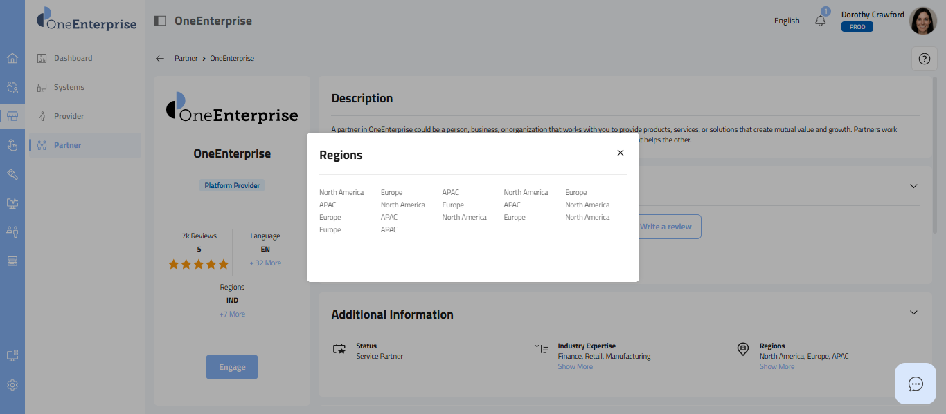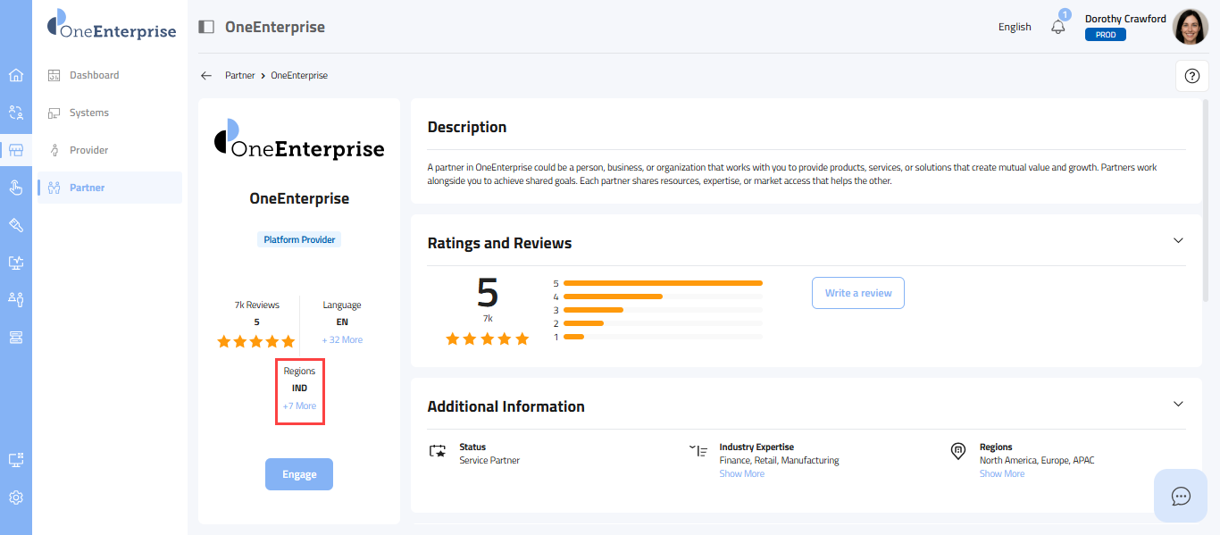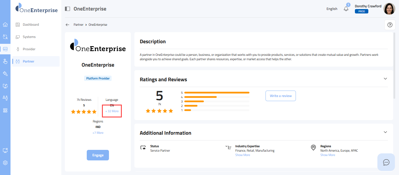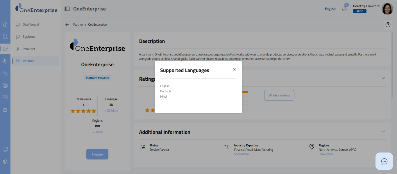 - This section provides a carefully selected set of details, starting with the partner's logo at the top, followed by the partner's name, the provider's name, the partner type (e.g., Sales, Marketing), the partner's status, its review and rating, the current language in use, supported languages, and the regions where the partner offers its services.