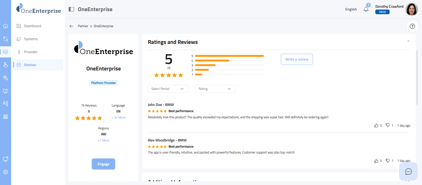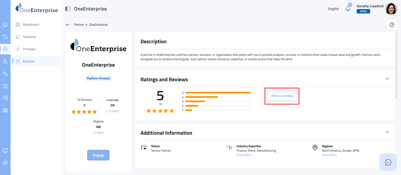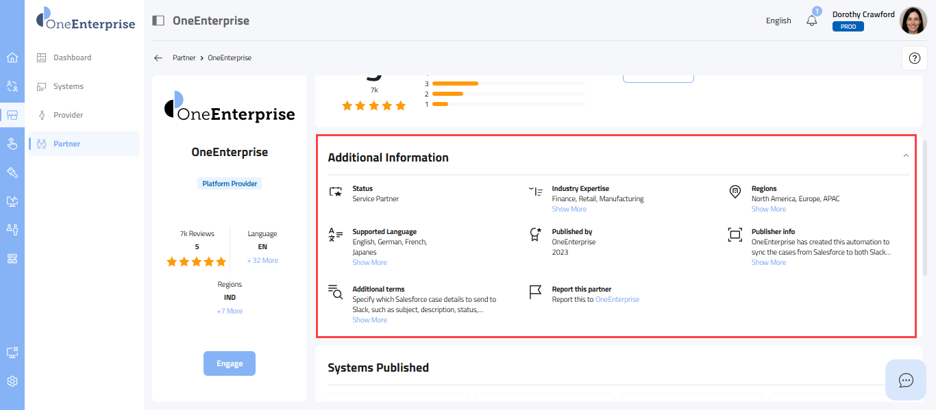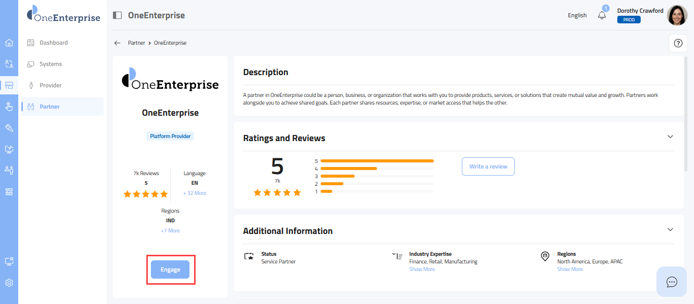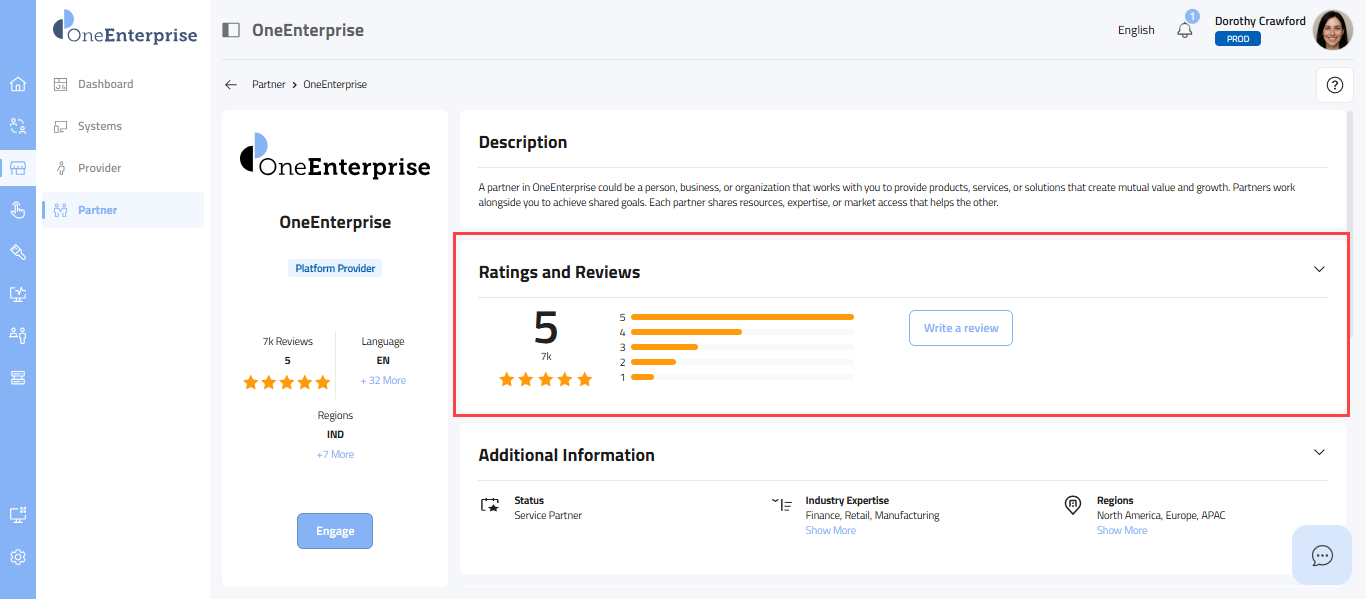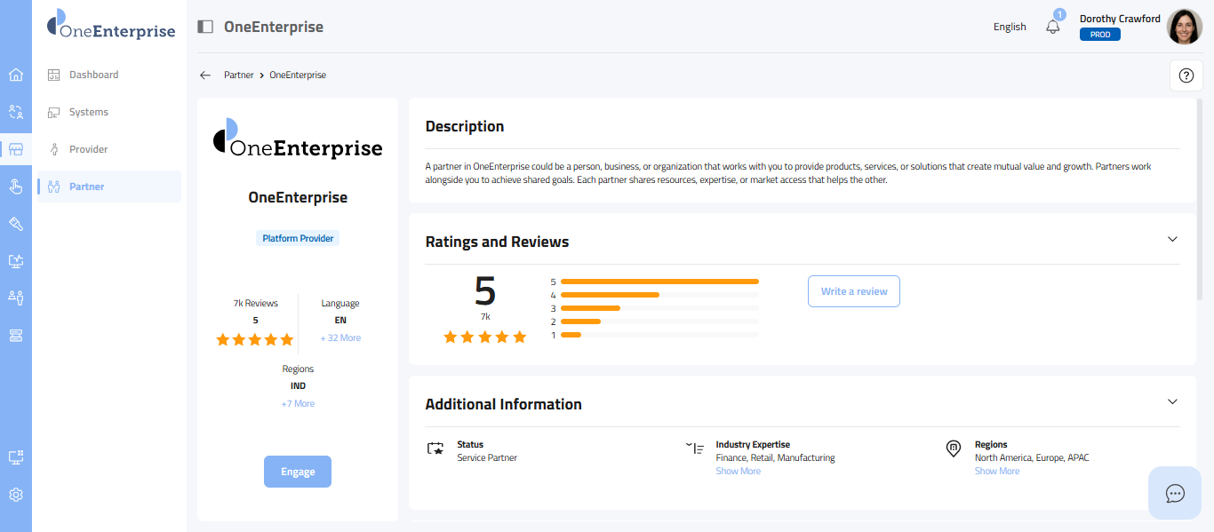 - This section provides a carefully selected set of details, starting with the partner's logo at the top, followed by the partner's name, the provider's name, the partner type (e.g., Sales, Marketing), the partner's status, its review and rating, the current language in use, supported languages, and the regions where the partner offers its services.