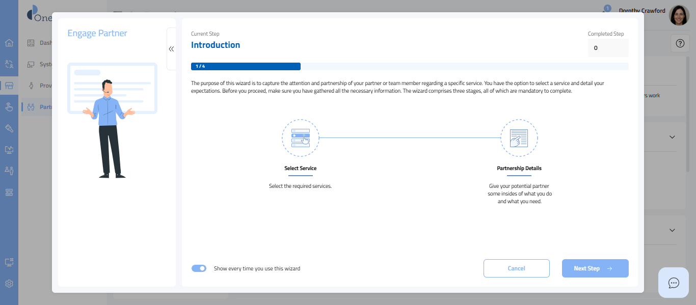 - Upon clicking the Engage button, an Engage Partner wizard will be initiated.