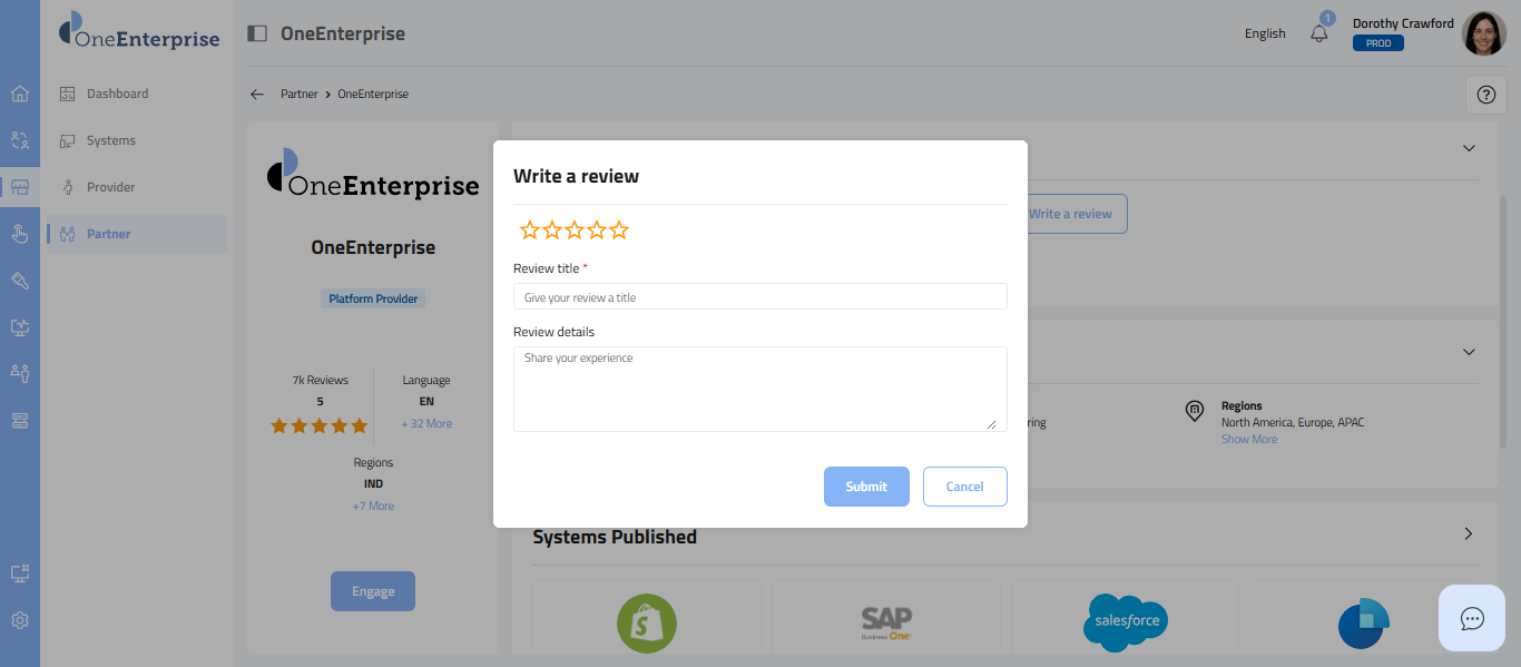 - To share your thoughts about the selected partner, simply click the "Write a Review" button. A pop-up will appear on your screen, where you can provide your feedback as follows: -