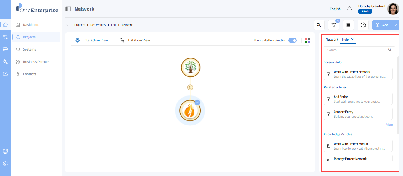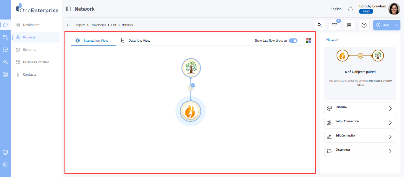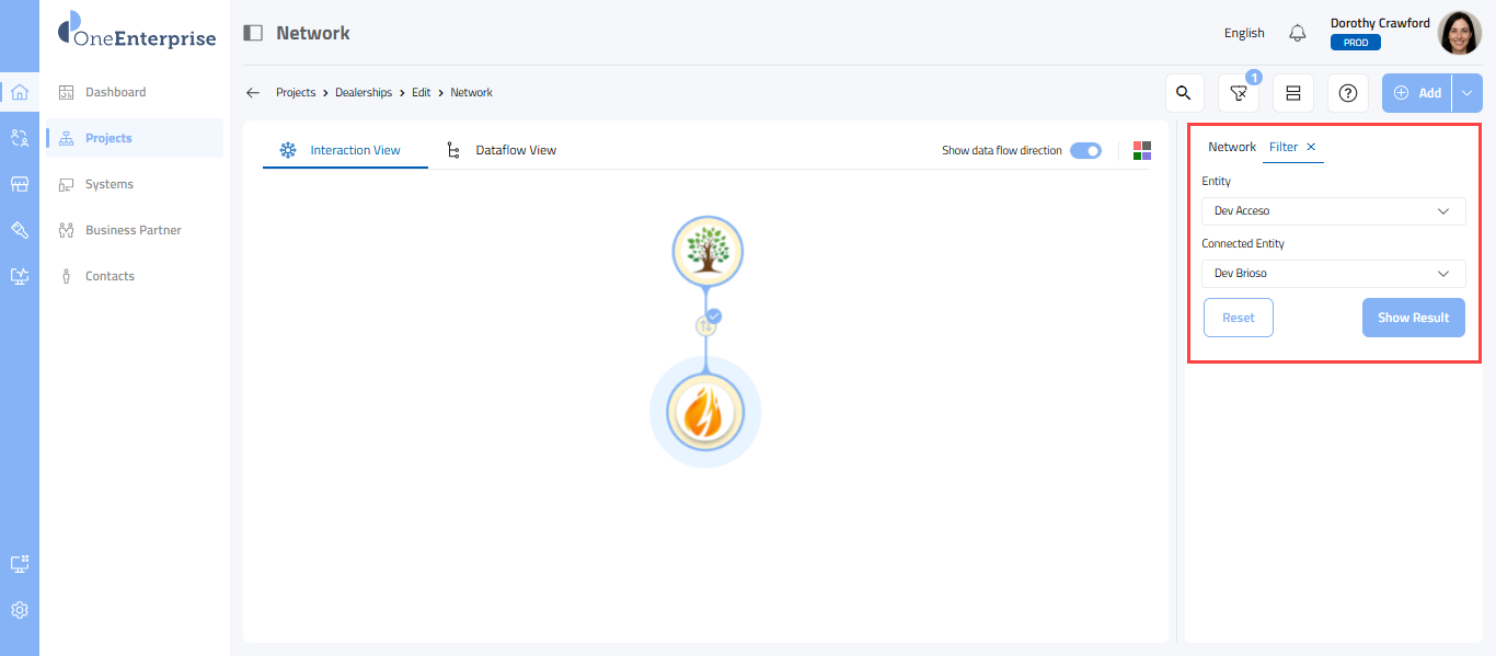 You can choose your preferred view mode for the project network, with two distinct modes available: the Interaction View and Dataflow View. The Interaction View provides a visual representation that focuses on the relationships and interactions among various components within your project, while the Dataflow View highlights the flow of information and processes. If you have not yet specified your preferred mode, the system defaults to the Interaction View for your convenience.