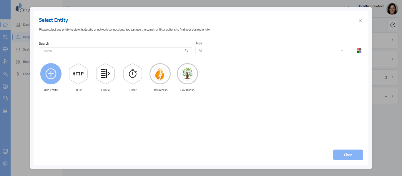 When you designate the Interaction view as your primary setting, selecting either Network (in edit mode) or Entity (found on the project tile) triggers a Select Entity pop-up. This pop-up presents a comprehensive list of entities currently associated with your project. These entities can include various elements identified as systems, automation, or channels, all of which play essential roles in your project’s architecture.