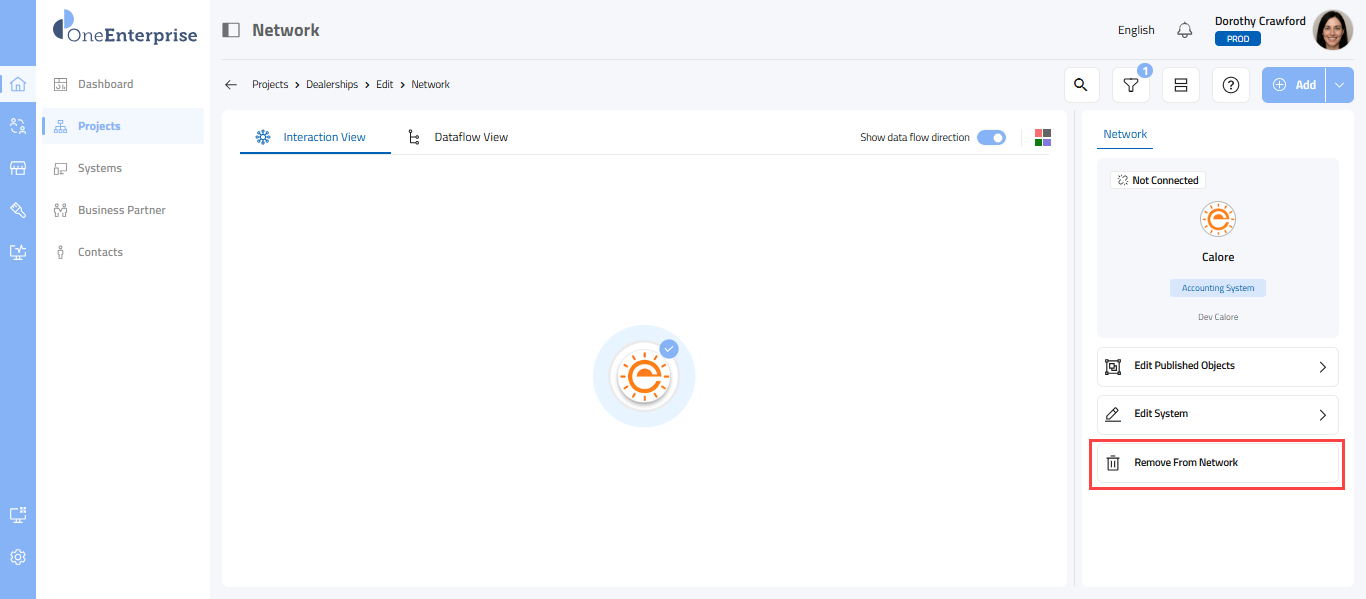 Click on the entity in the Interaction view that you want to remove. A 'Remove From Network' button will appear on the network tab. Click on the 'Remove From Network' to start the process.