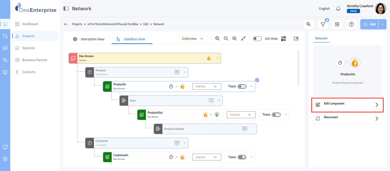 The Dataflow View provides a detailed, tree-like representation of the project network, displaying how different entities are interconnected and how data flows among them within a project network. In this comprehensive tree view, an entity or trigger is prominently positioned at the parent level, and objects, component center, and other subscribing entities are presented at the leaf level based on the subscription. Each connected entity is represented, showcasing the object and components through which data flows.