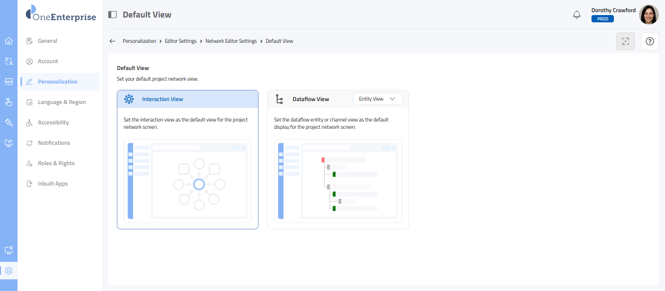You will find a dedicated setting in the application's Settings section to customize the view mode according to your needs. To navigate there, follow the path: Settings > Personalization > Editor Settings > Network Editor Settings > Default View. If you haven’t made any particular choices, you'll automatically see the Interaction View when you open your project network.