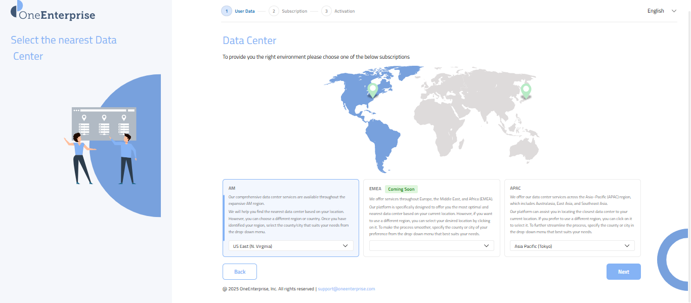 - After clicking the Next button on the previous screen, you will be directed to the Data Center screen, where you will need to choose the nearest data center for registration. However, based on the selected country on the previous screen, we will prefill the appropriate data center for you. You can continue with the prefilled data center or you can choose another data center of your choice.