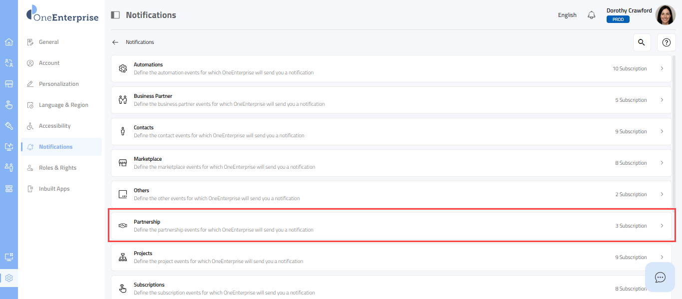This section delineates the procedure for subscribing to notifications from the Partnership module. Within the Partnership module, various types of notifications have been categorized for subscription purposes.